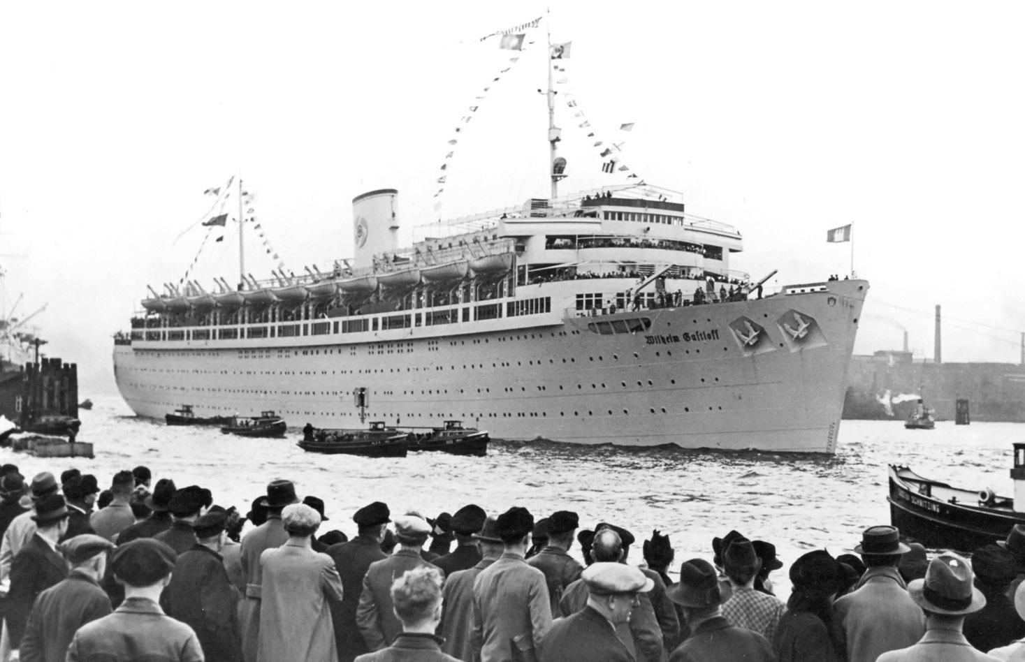 [Below: The KDF sister ship of the Robert Ley -- The Wilhelm Gustloff. It suffered the tragic fate of being sunk by a Soviet submarine at the war's end, losing nearly 10,000 lives. It was loaded with civilians (mostly women, children, and elderly) and the wounded, who were fleeing west in advance of the Soviet murder machine.]