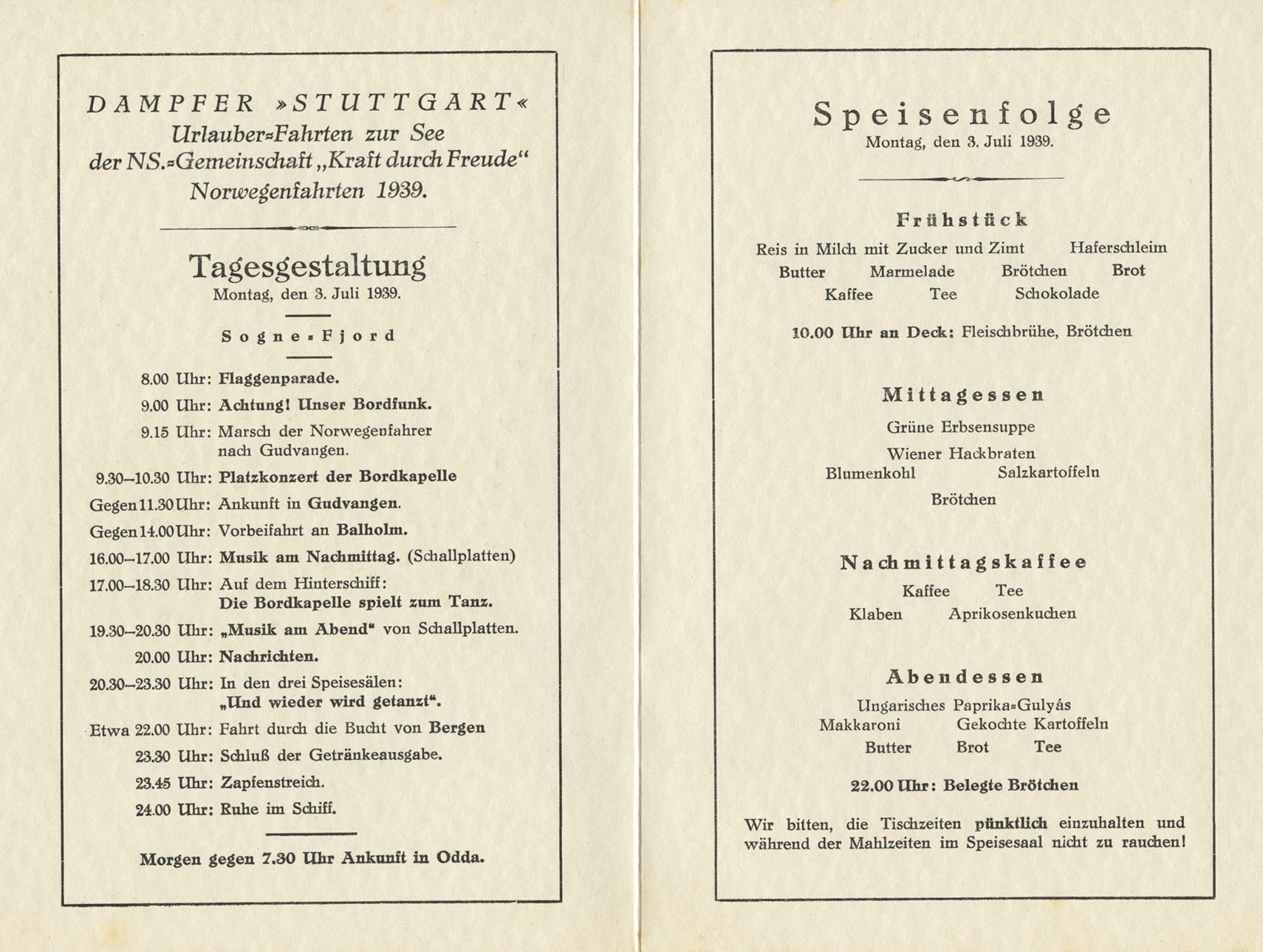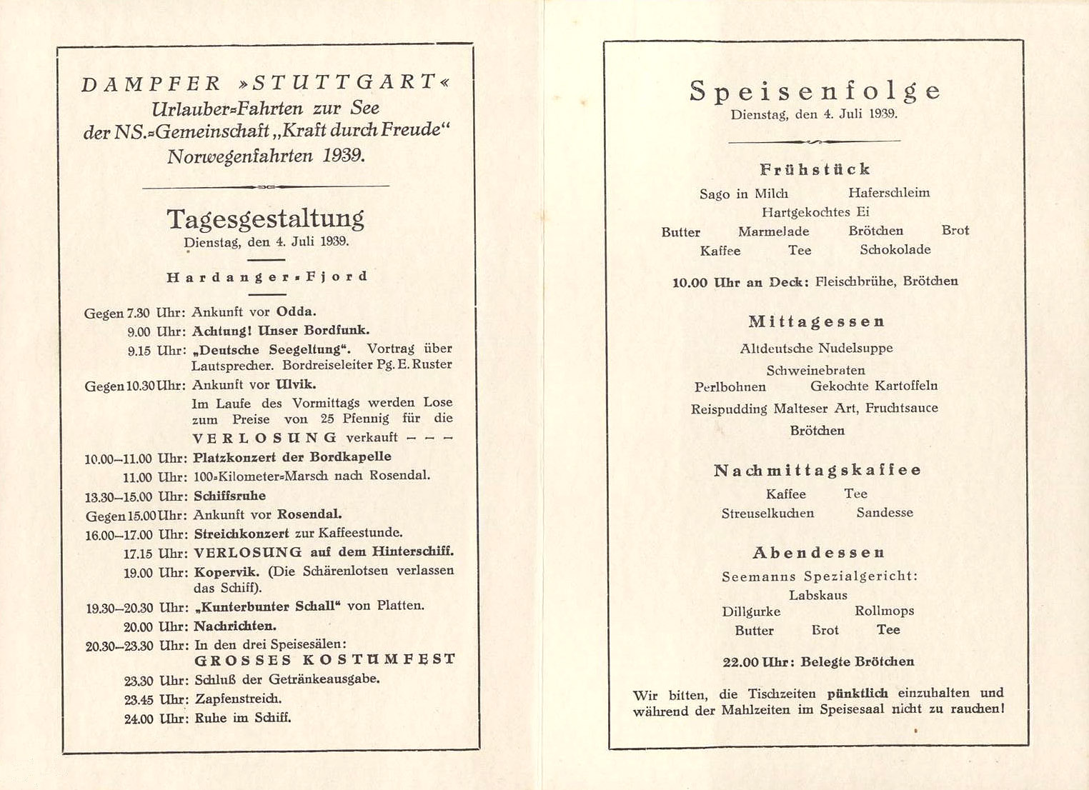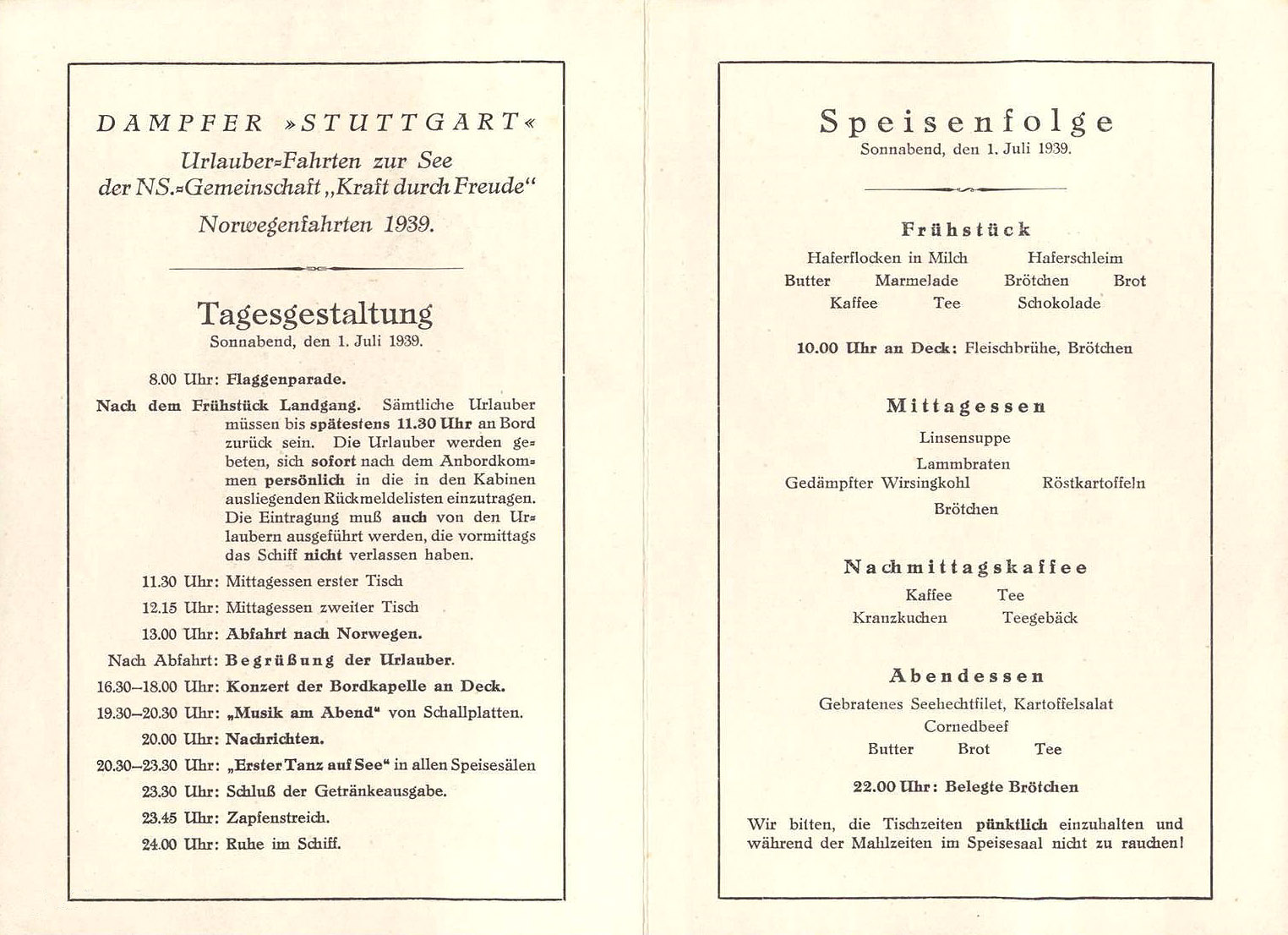 [Below: 1939 event schedule and menu from the 'Stuttgart'.]