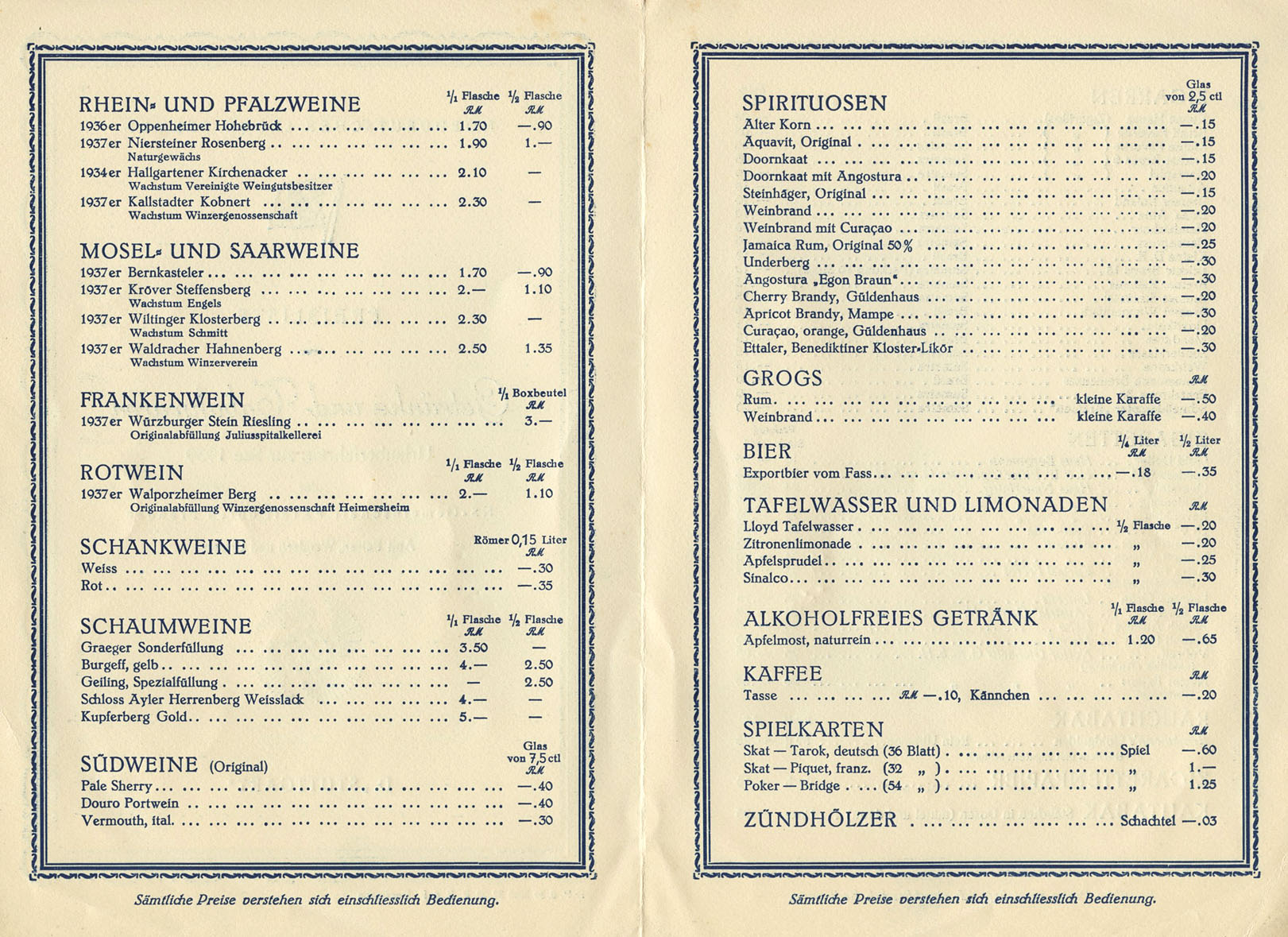 [Below: 1939 event schedule and menu for 'Der Deutsche'. The 'Norddeutscher Lloyd Bremen' was a German shipping company founded in Bremen.]