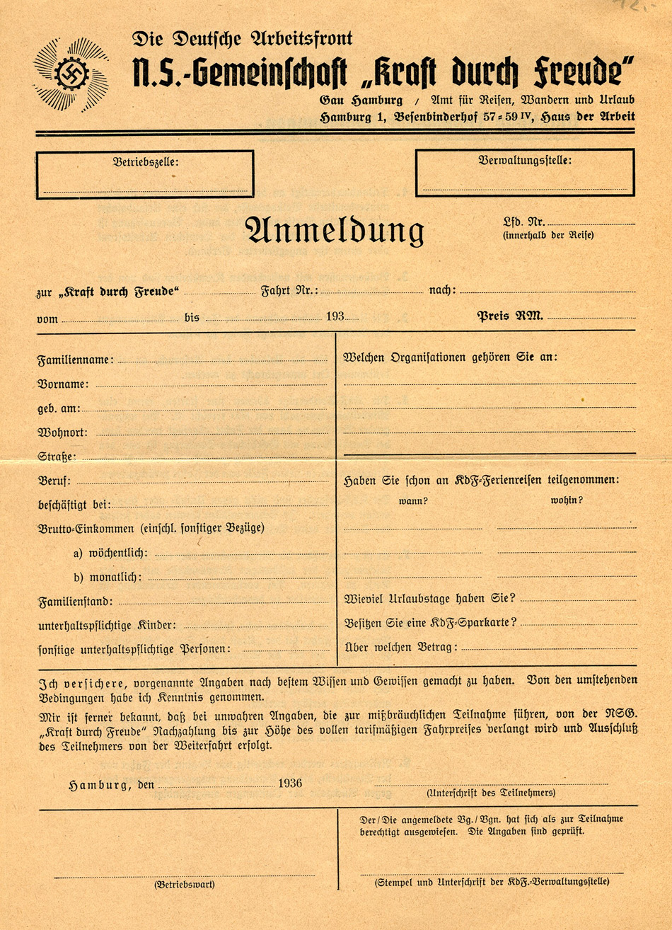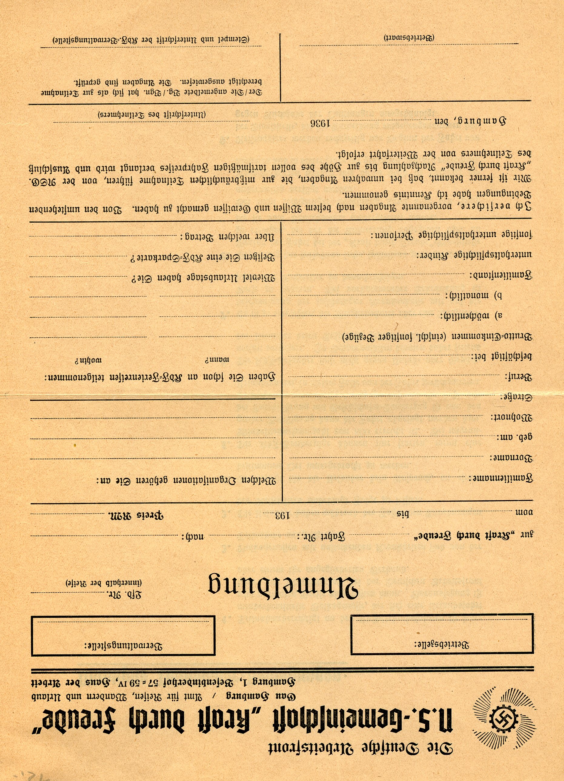 [Below: This is a February 1936 vacation registration form from the Strength Through Joy Hamburg district.]