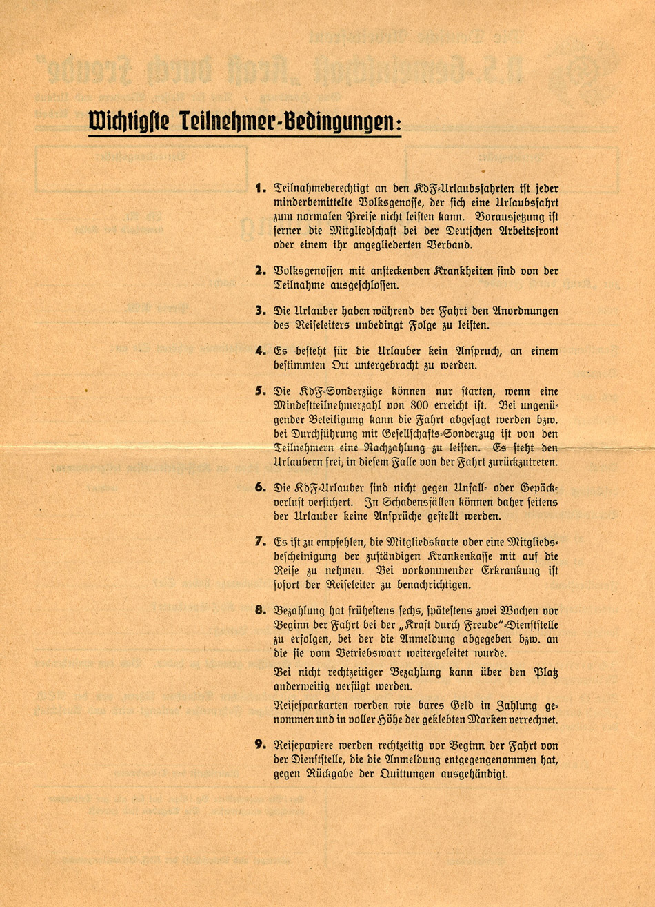 Any underprivileged citizen who cannot afford a holiday trip at normal prices is eligible to take part in the KDF holiday trips. A further requirement is membership in the German Labor Front or an affiliated association.)]