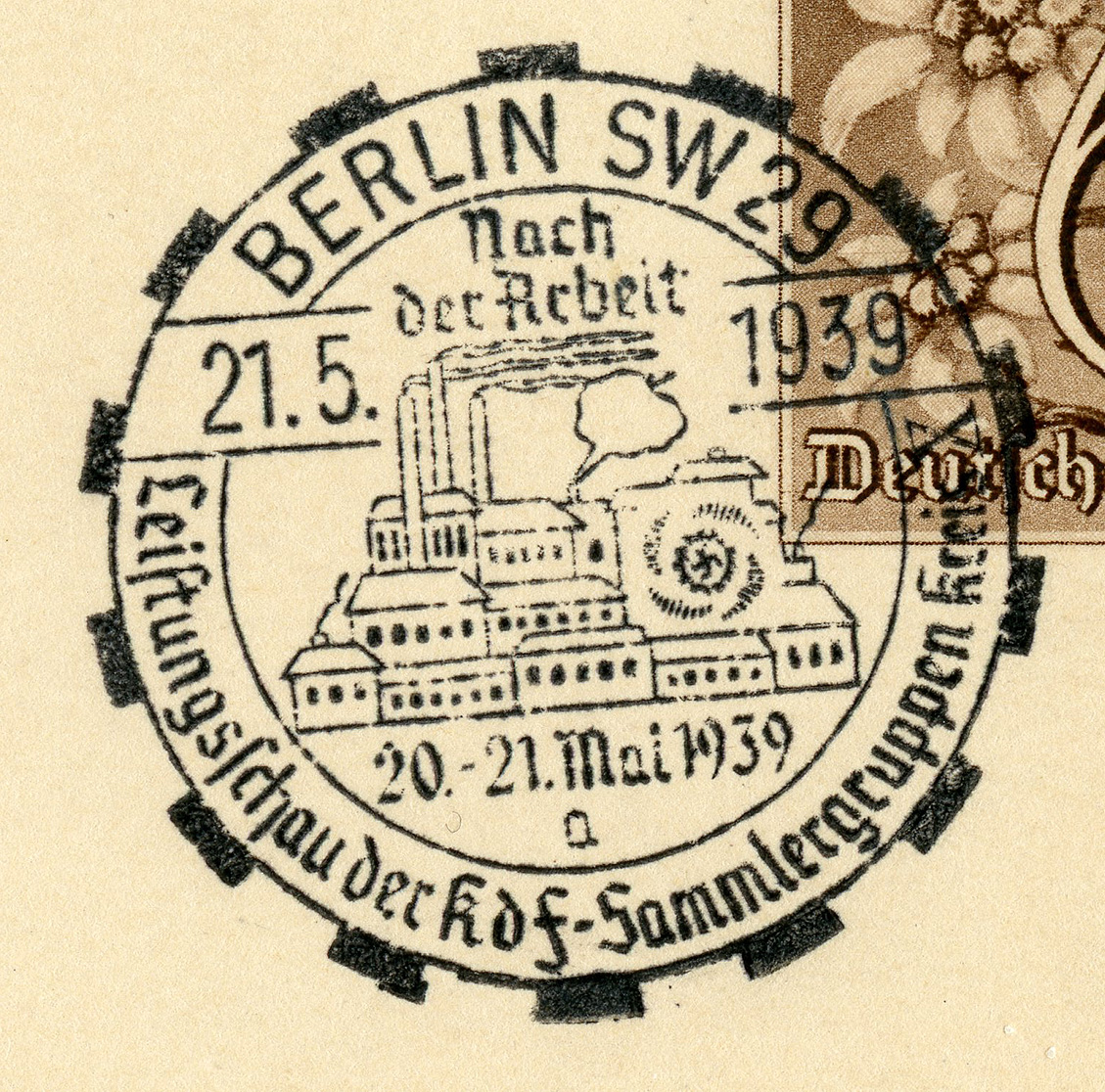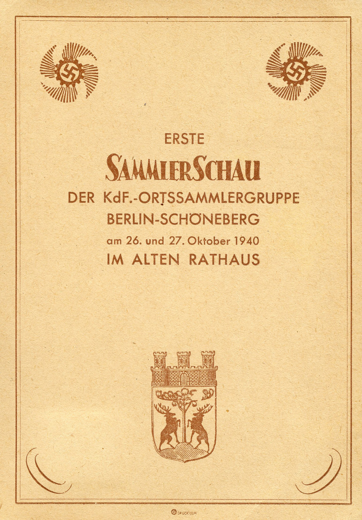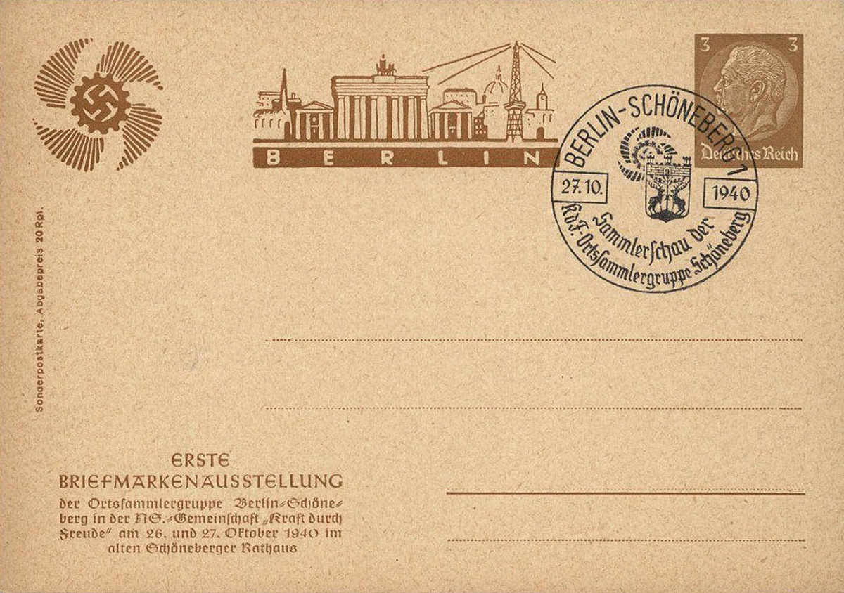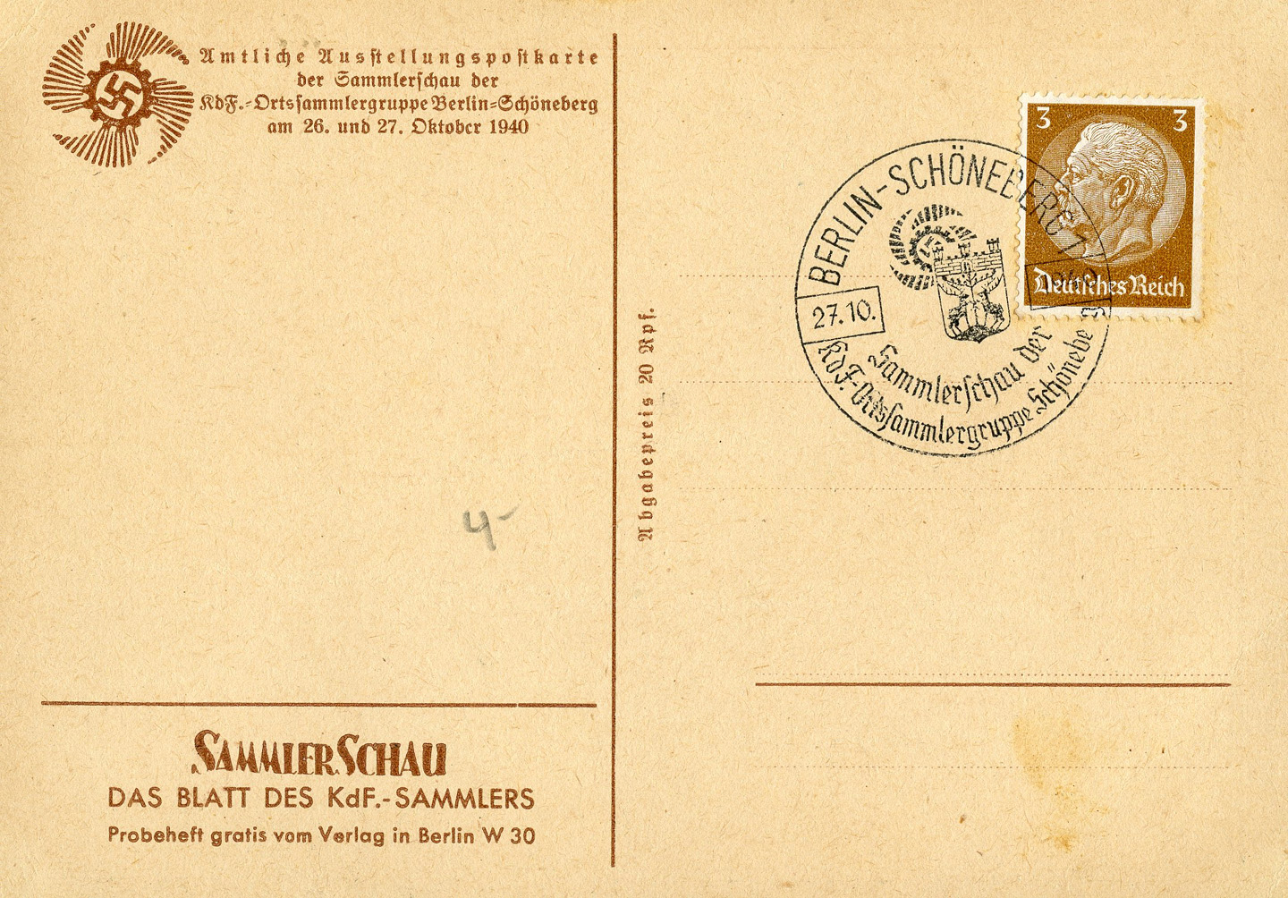[Below: This postcard, postmarked on October 27, 1940, is adverising a stamp collectors show, at the top it says: 'Sammlerschau der KdF Ortssammlergruppe' (Collector's show of the KdF local collector group). At the bottom it says: 'Erste Briefmarkenausstellung der Ortssammlergruppe Berlin=Schöneberg in der NS.=Gemeinschaft "Kraft durch Freude" am 26. und 27. October 1940 im alten Schöneberger Rathaus' (First stamp exhibition of the local collector group Berlin=Schöneberg in the NS.=Community "Strength through Joy" on October 26th and 27th, 1940 in the old Schöneberg town hall).]