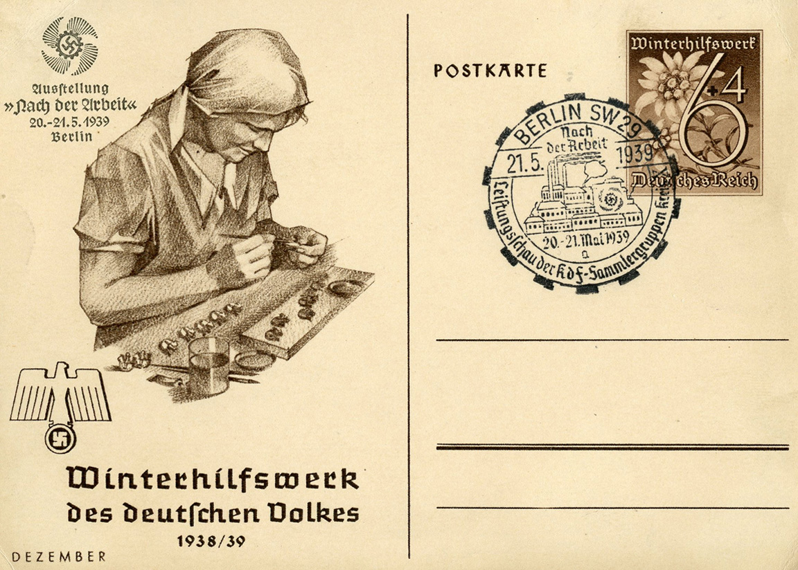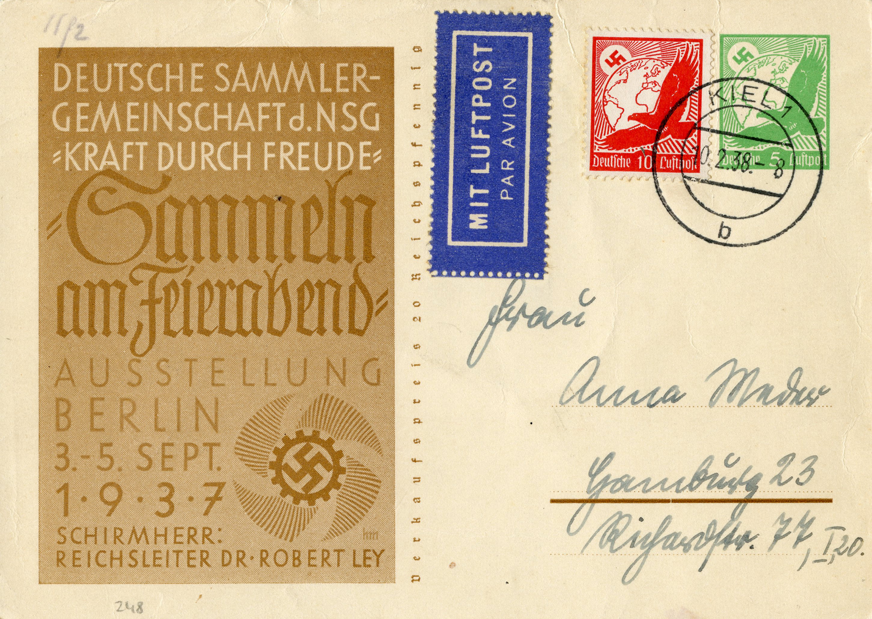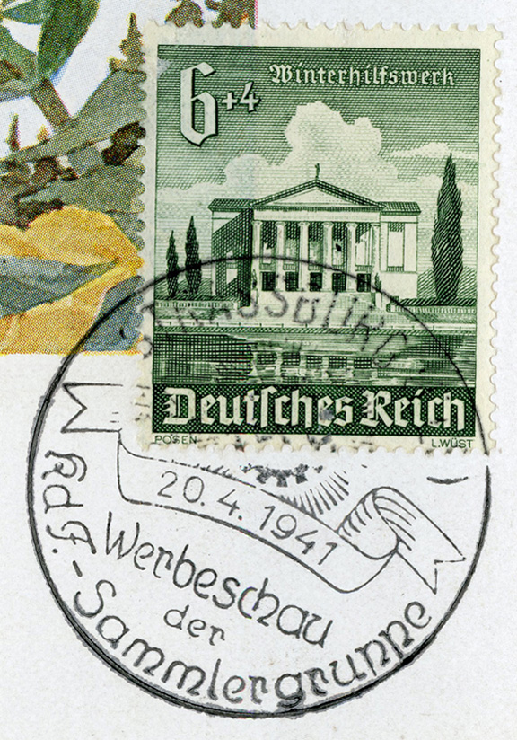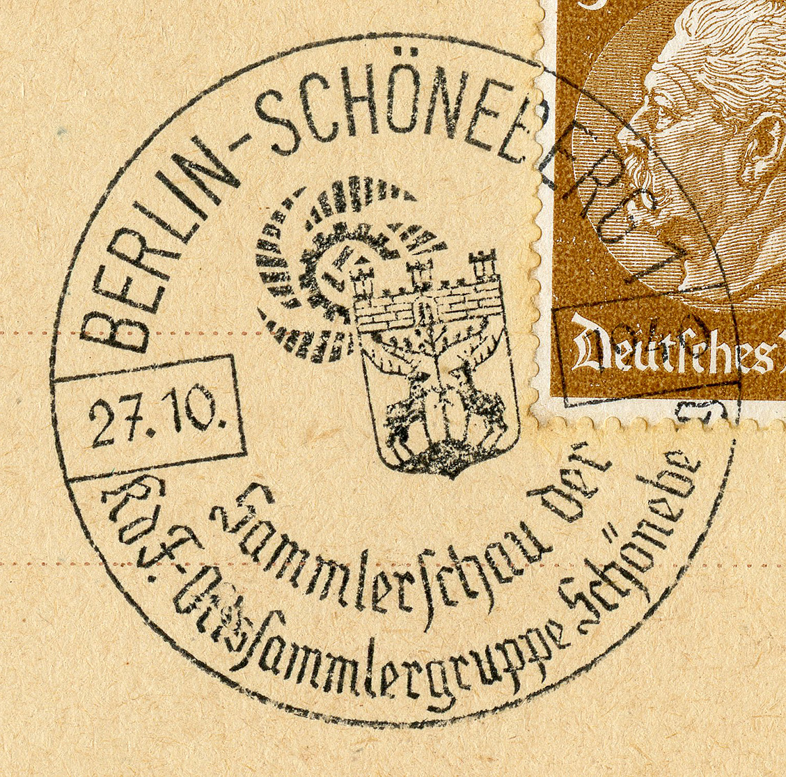 [Below: This postcard, postmarked on October 27, 1940, is adverising a stamp collectors show, at the top it says: 'Sammlerschau der KdF Ortssammlergruppe' (Collector's show of the KdF local collector group). At the bottom it says: 'Erste Briefmarkenausstellung der Ortssammlergruppe Berlin=Schöneberg in der NS.=Gemeinschaft "Kraft durch Freude" am 26. und 27. October 1940 im alten Schöneberger Rathaus' (First stamp exhibition of the local collector group Berlin=Schöneberg in the NS.=Community "Strength through Joy" on October 26th and 27th, 1940 in the old Schöneberg town hall).]