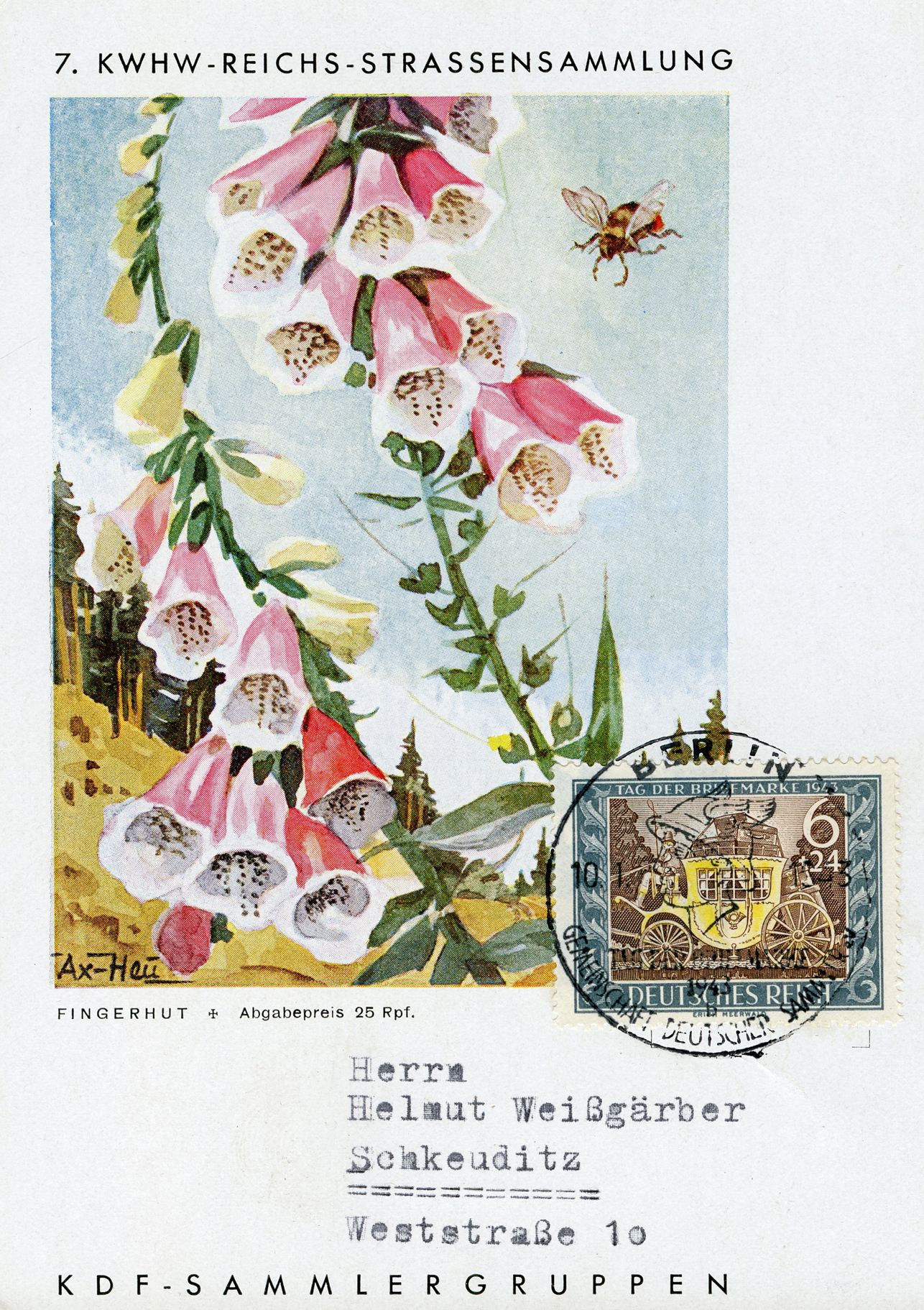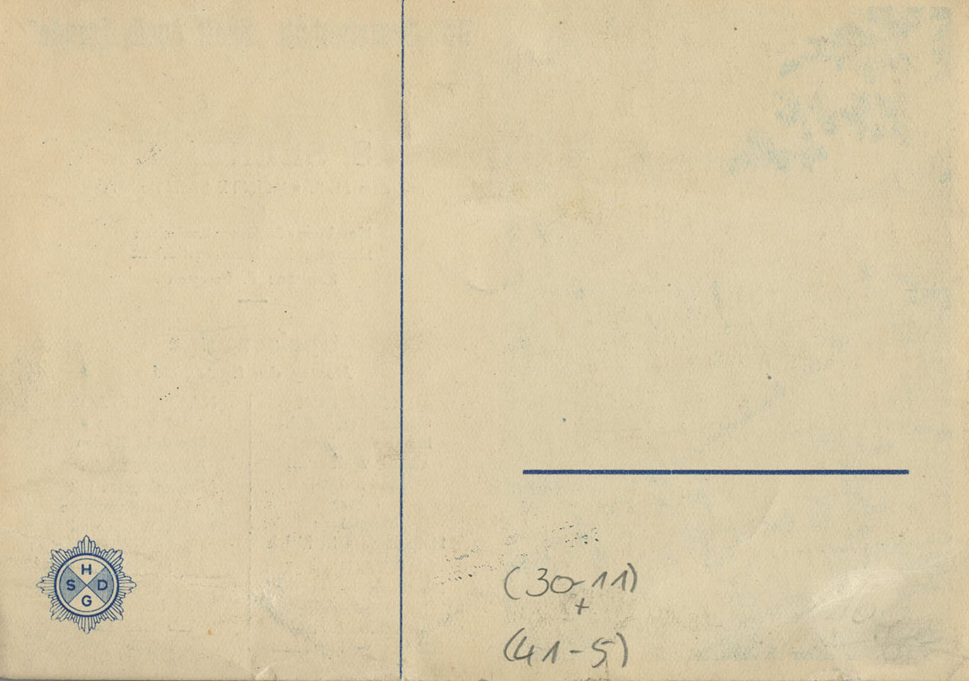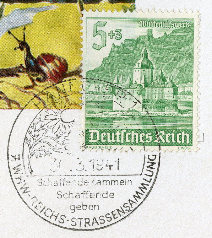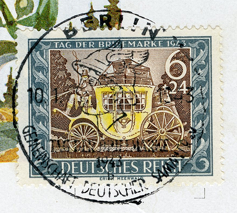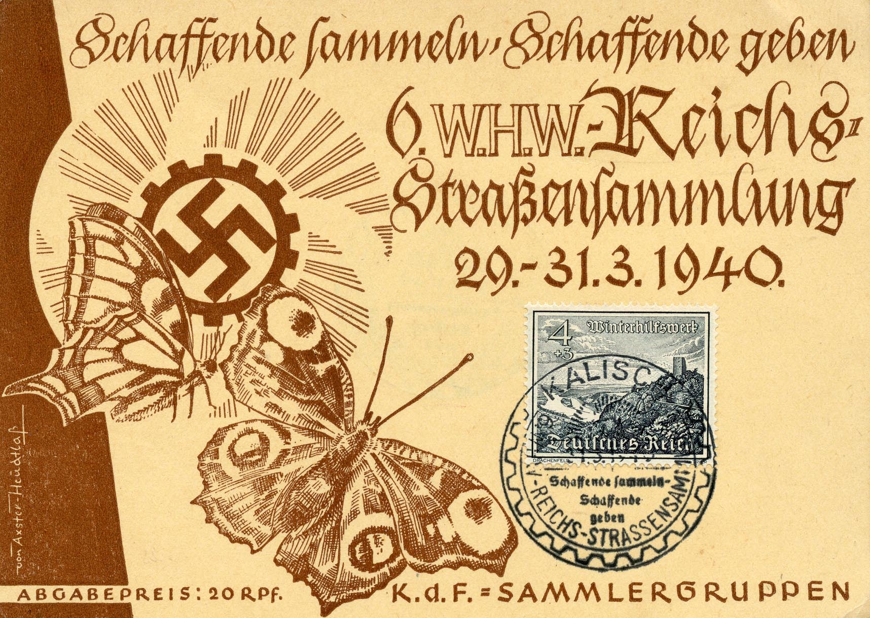 [Below: This postcard, postmarked on October 27, 1940, is adverising a stamp collectors show, at the top it says: 'Sammlerschau der KdF Ortssammlergruppe' (Collector's show of the KdF local collector group). At the bottom it says: 'Erste Briefmarkenausstellung der Ortssammlergruppe Berlin=Schöneberg in der NS.=Gemeinschaft "Kraft durch Freude" am 26. und 27. October 1940 im alten Schöneberger Rathaus' (First stamp exhibition of the local collector group Berlin=Schöneberg in the NS.=Community "Strength through Joy" on October 26th and 27th, 1940 in the old Schöneberg town hall).]