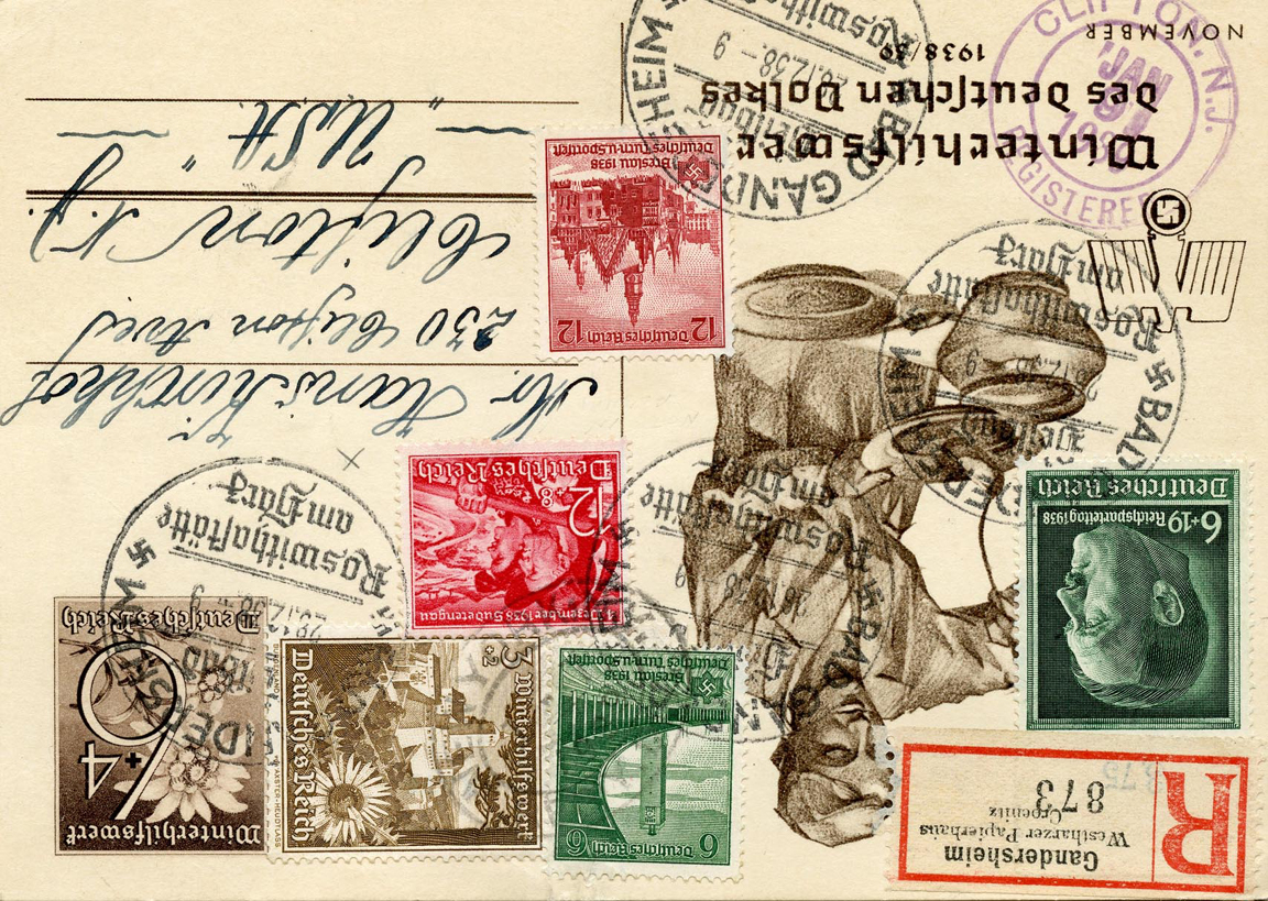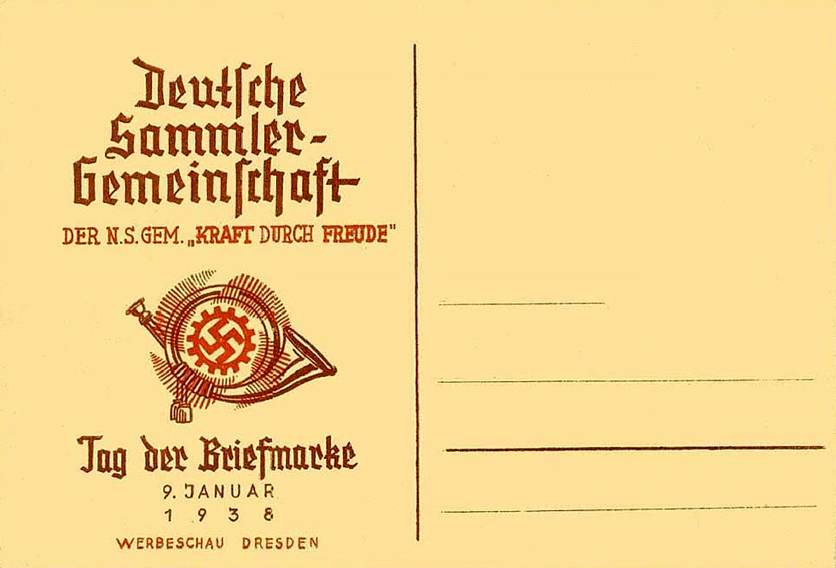 [Below: This postcard, from January 9, 1938, celebrates 'Stamp Day', at the top it says: 'Deutsche Sammler Gemeinschaft' (German Collector Community).]