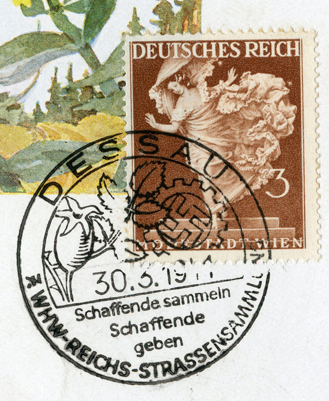 [Below: Close-up. The cancel says 'Schaffende sammeln Schaffende geben' (Creators collect, creators give). Click to enlarge.]