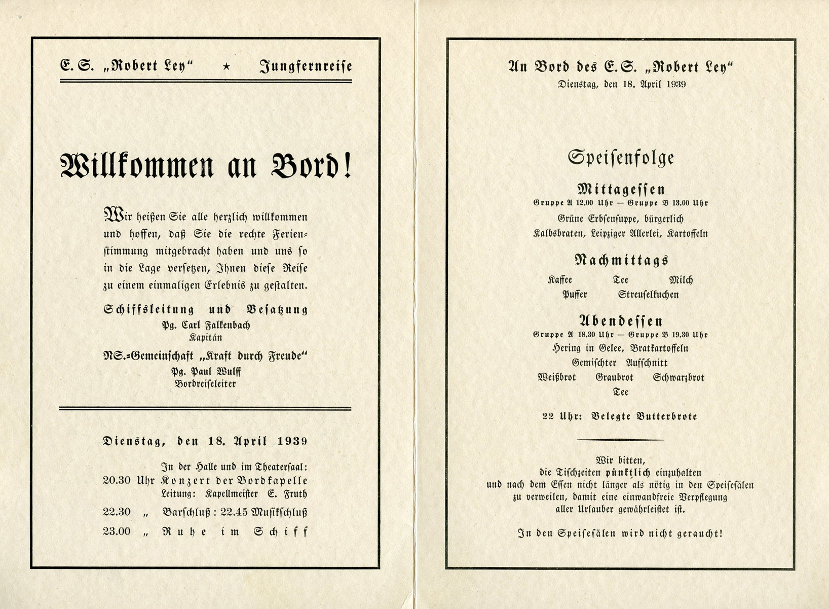 [Below: Inside. April 1939 event schedule and menu for the luxury liner 'Robert Ley'.]