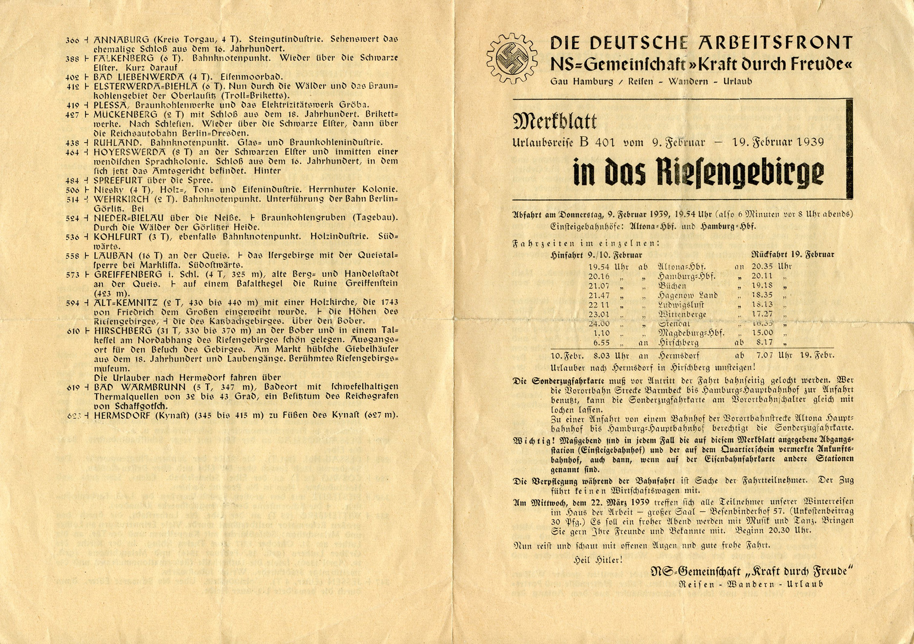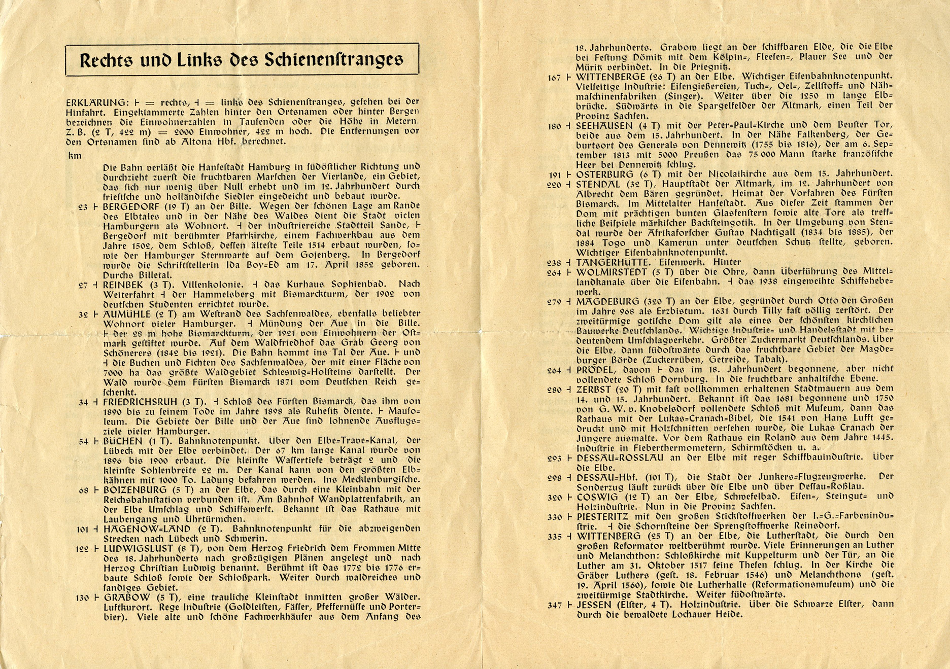 [Below: Inside. 'Rechts und Links des Schienenstranges' (Right and left of the rail track). This is an informational guide to tell the vacationers what sights they are seeing outside the windows of the train.]