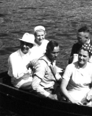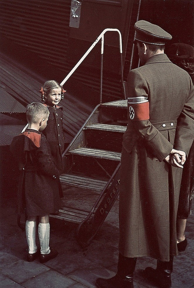 [Below: Holde, Heide and Hedda Goebbels with Käthe Hübner (their older siblings' governess - a governess is a woman employed to teach and train children in a private household, in contrast to a nanny she concentrates on teaching children instead of meeting their physical needs) & her fiancé, circa 1944.]