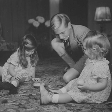 [Below: Helga Goebbels and Hilde Goebbels playing in their garden with brother Harald Quandt and his friends, circa 1935.]