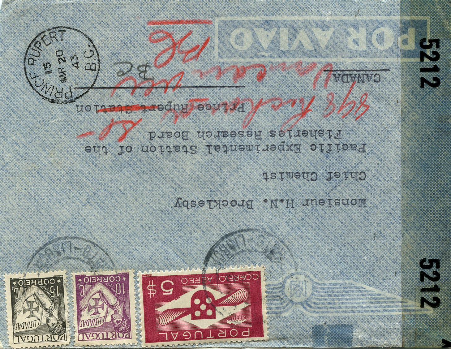 [Below: Here is an envelope that was canceled in February of 1943 and sent to Canada, where it was censored. It has a receival stamp of March 20, 1943.]