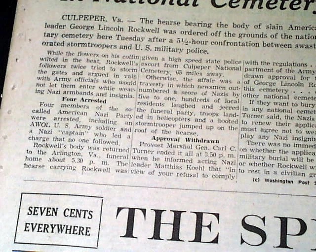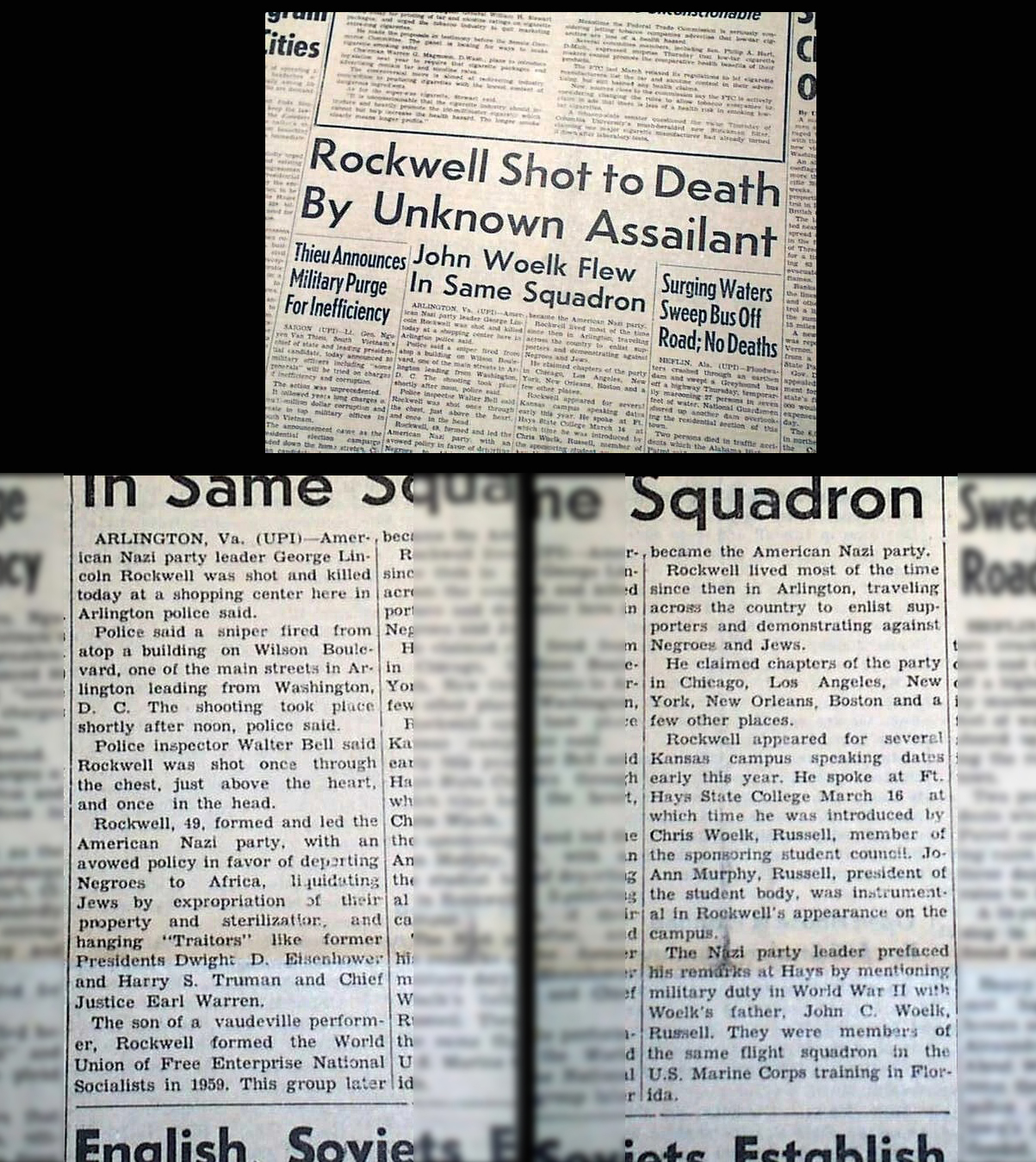 [Below: The New York Daily News: 'Sniper Slays Nazi Rockwell', August 25, 1967.]