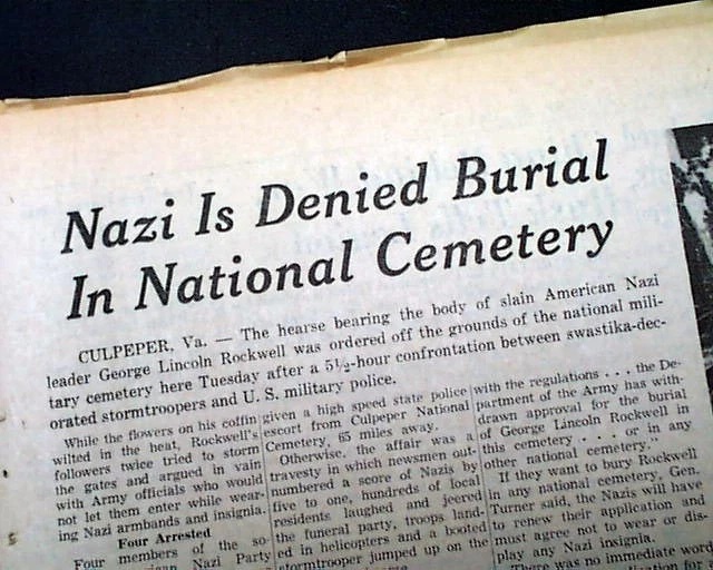 [Below: A press photo showing one of Rockwell's men being arrested after the Culpeper National Cemetery closes its gates, denying the hearse carrying Rockwell's body to be interned amongst his fellow soldiers. The Culpeper National Cemetery is a United States National Cemetery located in the town of Culpeper, Virginia. It is administered by the United States Department of Veterans Affairs and has over 14,000 military graves. Rockwell, a veteran of WWII, who made the rank of commander, meant nothing to them. They chew you up and spit you out when you are of no more use to them, especially if you expose them, as Rockwell spent the better portion of his life doing.]