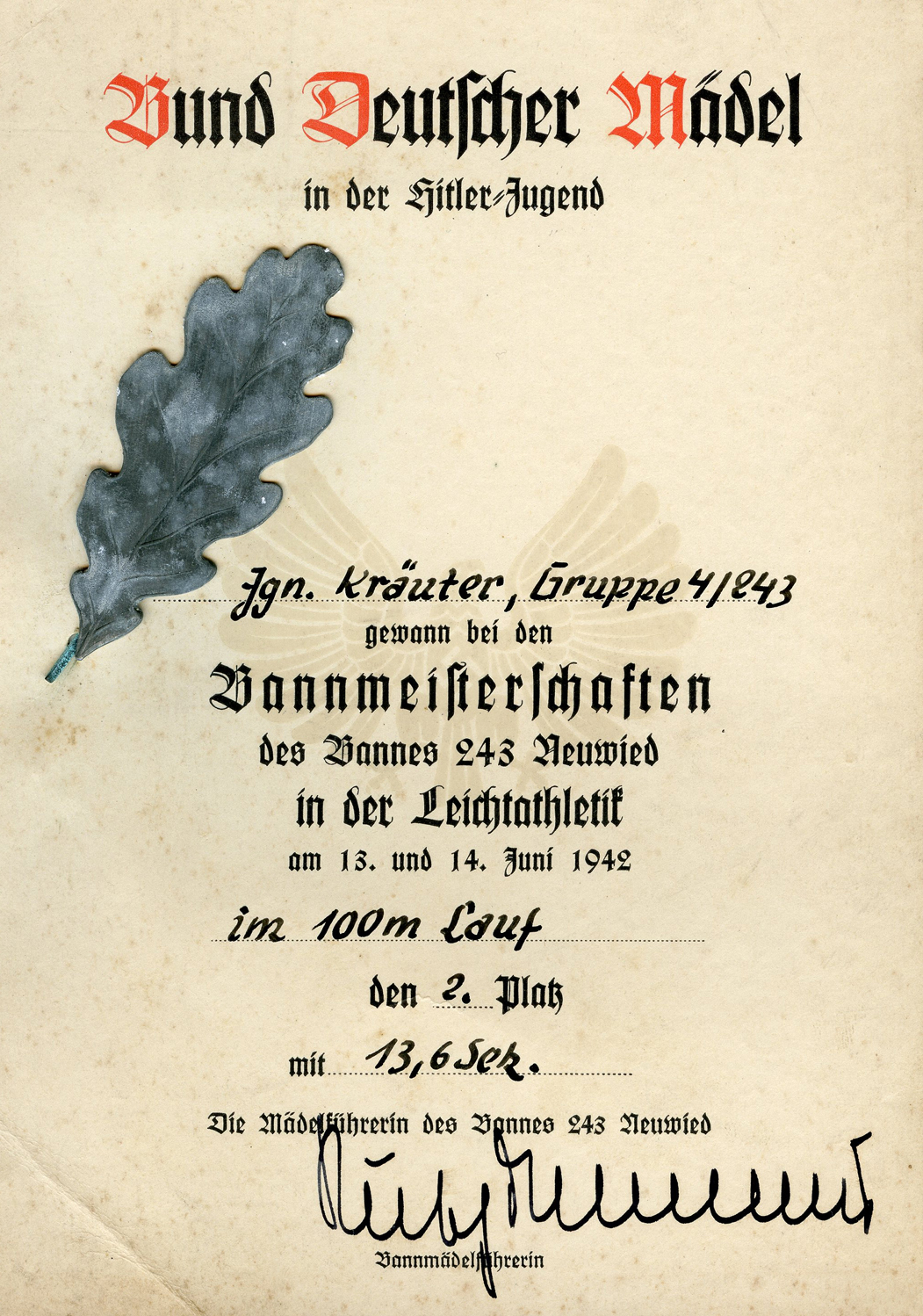 [Below: I was pleased to find more award documents from Elisabeth's sister, Helma! This first certificate was awarded to Helma for 2nd place in the 100m race, dated June 13-14, 1942.]