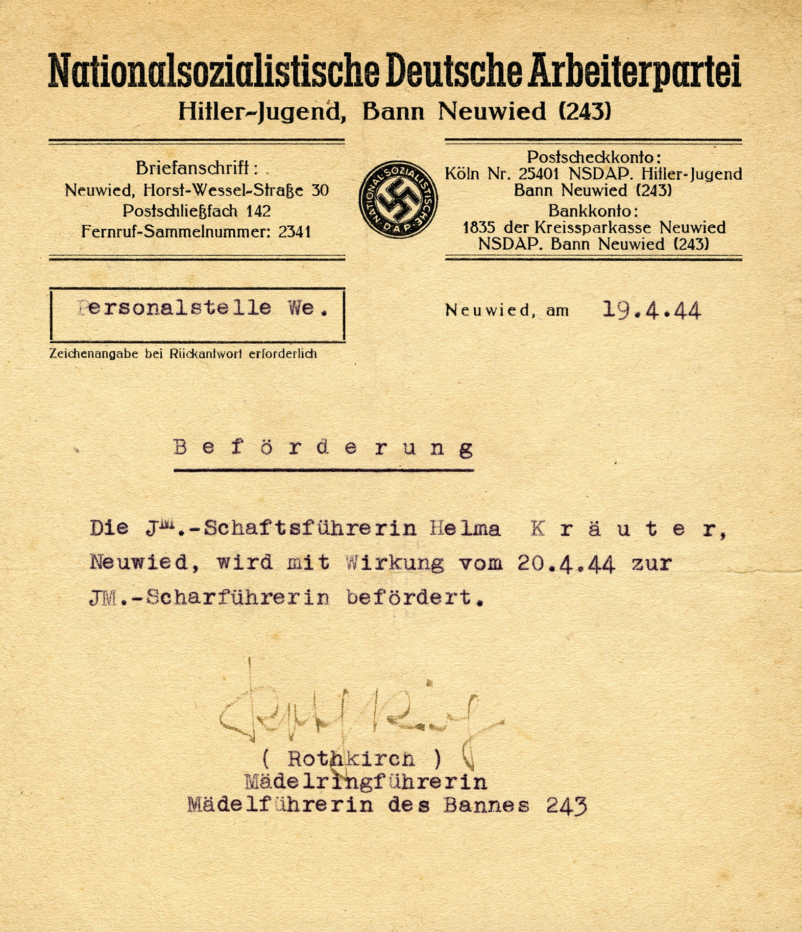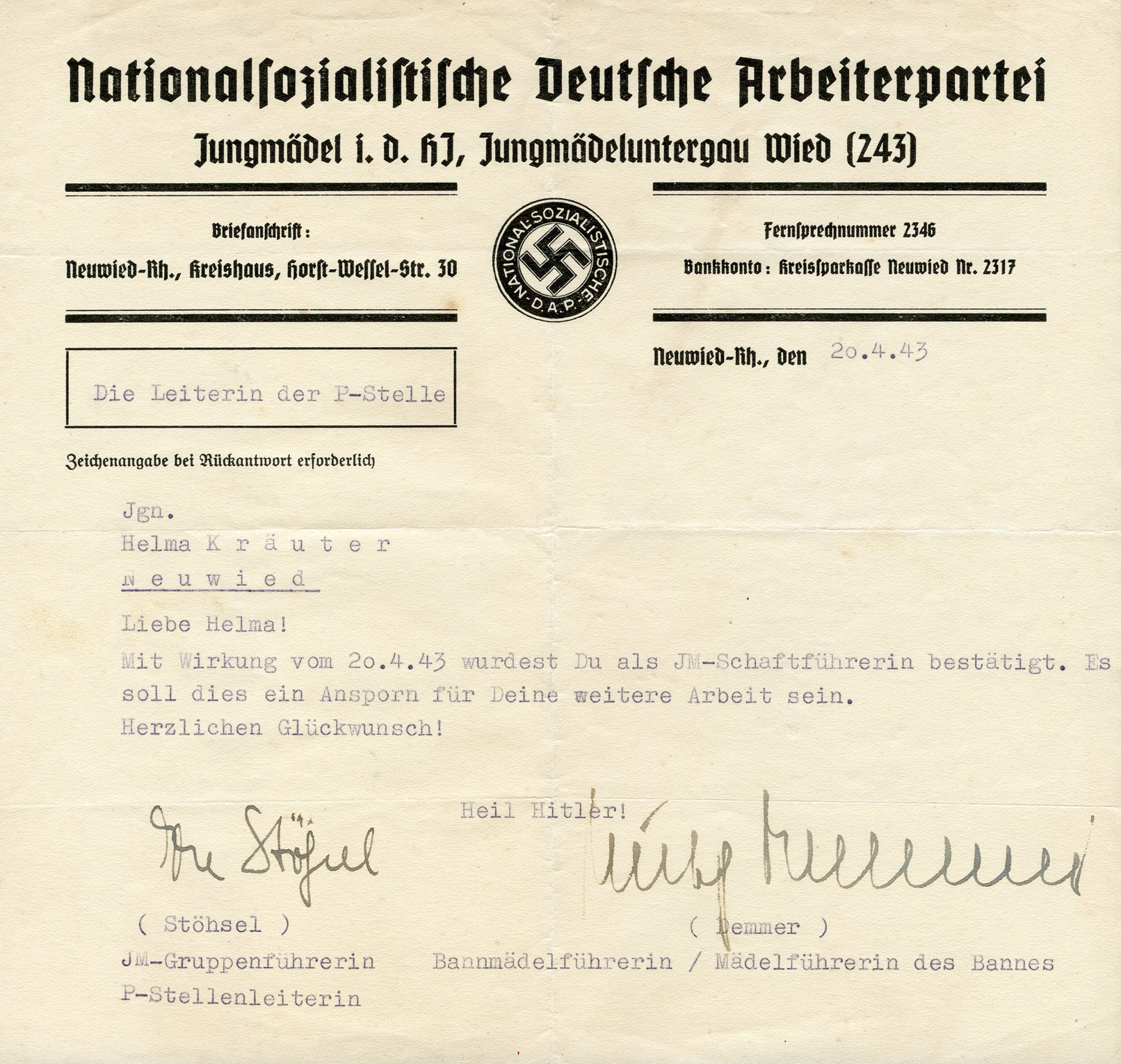 'Mit Wirkung vom 20.4.43 wurdest Du als JM-Schaftführerin bestätigt. Es soll dies ein Ansporn für Deine weitere Arbeit sein.'
