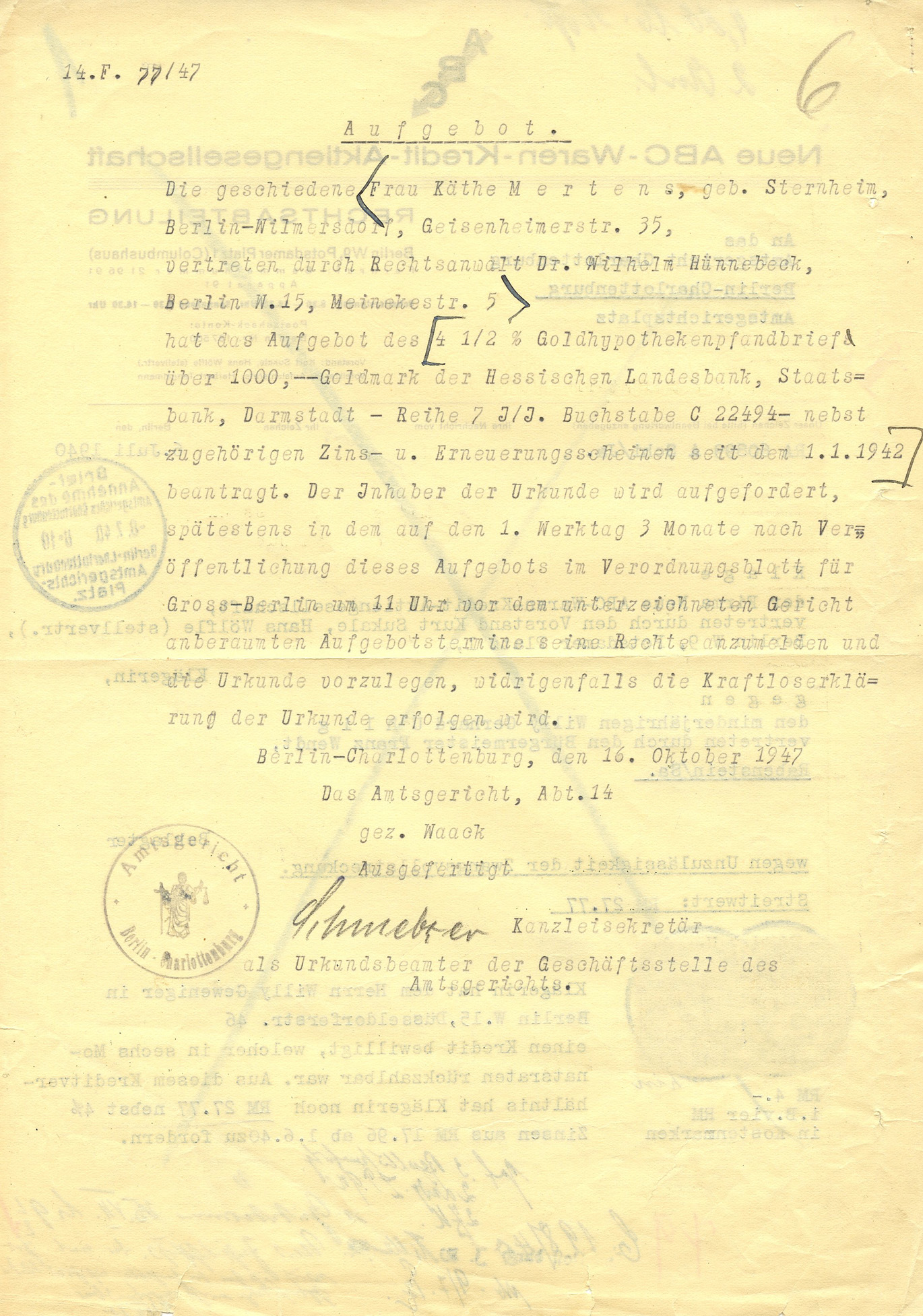 hat das Aufgebot des 4 1/2% Goldhypothekenpfandbrief'