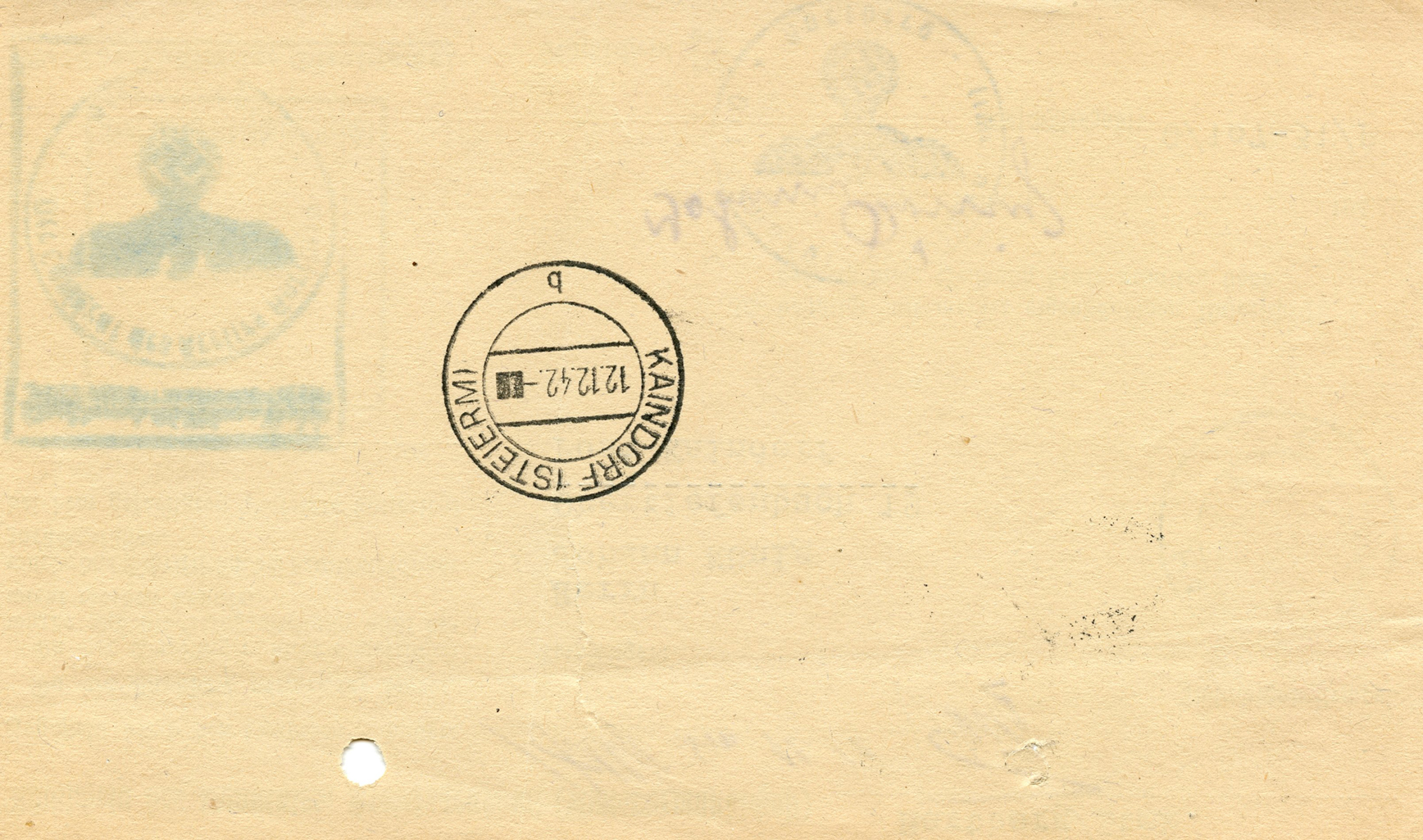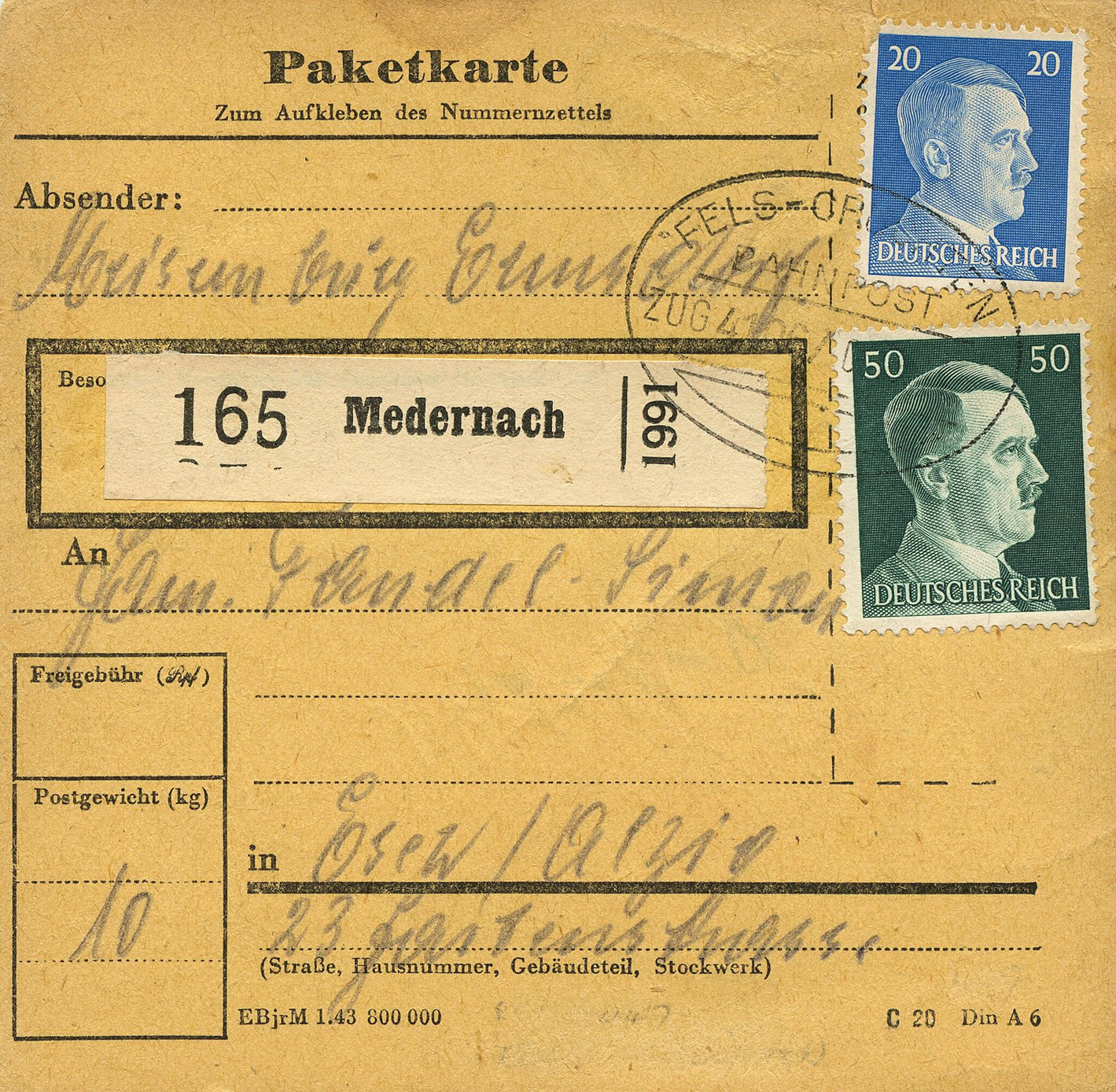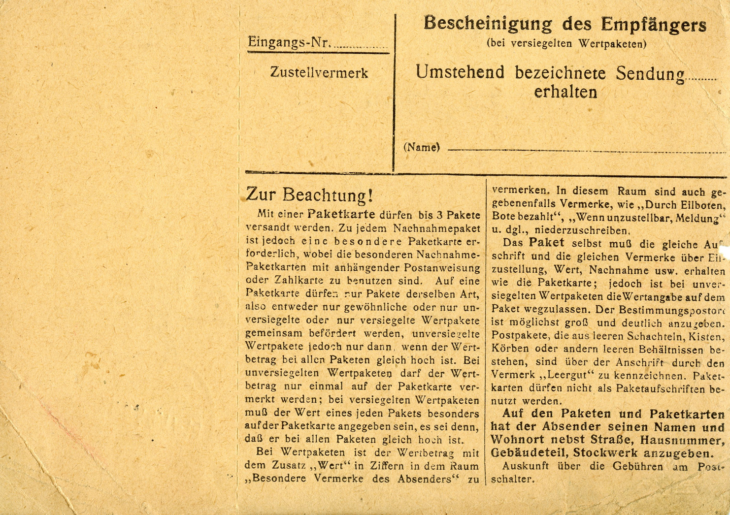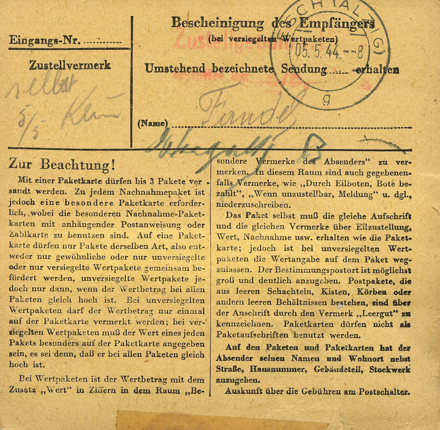 [Below: This is a parcel receipt, from Chemnitz, March 21, 1944.]