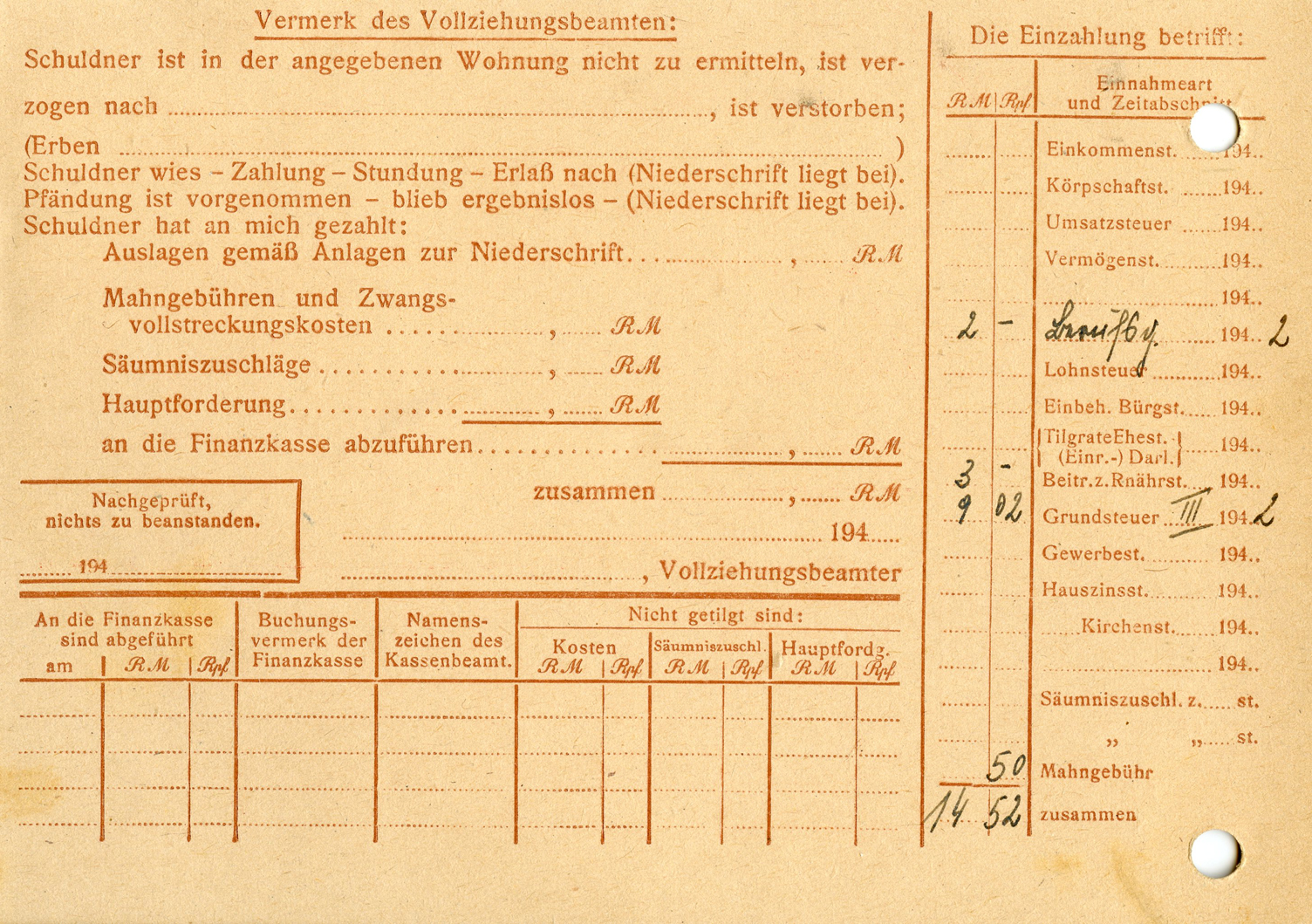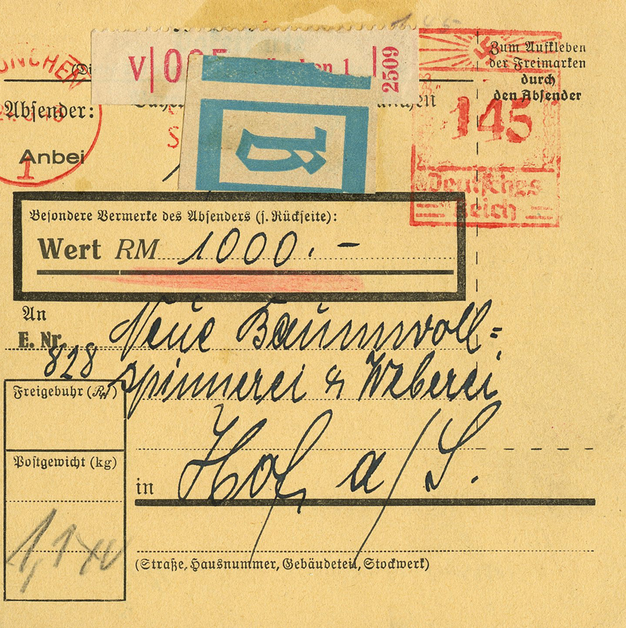 [Below: This is a parcel receipt, from Munich, May 25, 1943. This had a value of 1,000 RM! A lot of money back in 1943.]