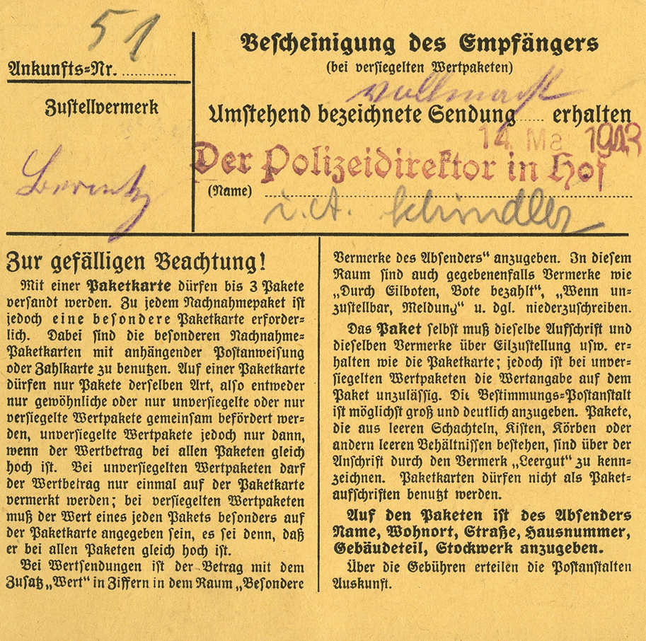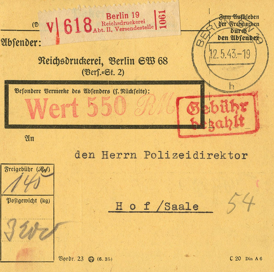 [Below: This is a parcel receipt, from Berlin, May 12, 1943. This had a value of 550 RM and was sent to the Chief Superintendent of Police.]