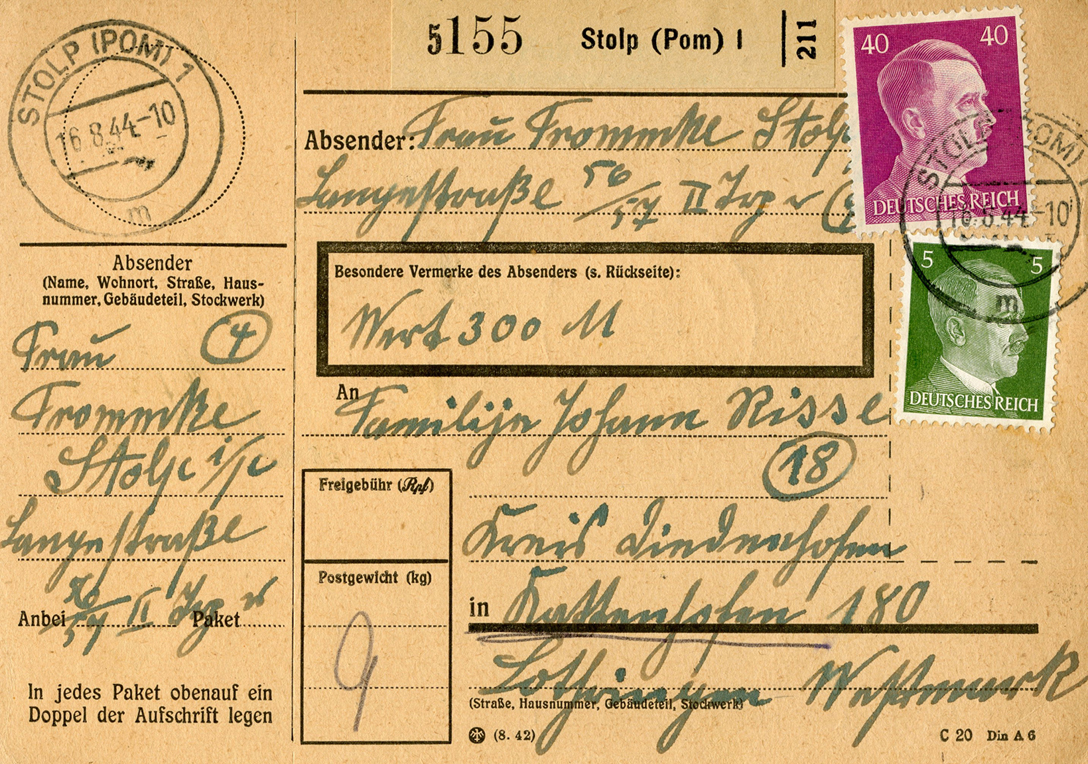[Below: Here is a parcel receipt from Stolp, Pomerania, August 16, 1944.]