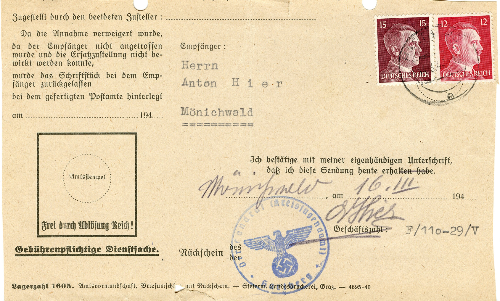 [Below: Item #1. These are strange and I've never seen them before. At the top it says 'Return receipt from the District Administrator, District of Youth Welfare Office (Guardianship)'. It also says 'Since acceptance was refused, since the recipient was not found and delivery could not be effected, the document was left with the recipient, deposited at the post office where it was issued.' I'm guessing these are options to mark depending on the situation.]
