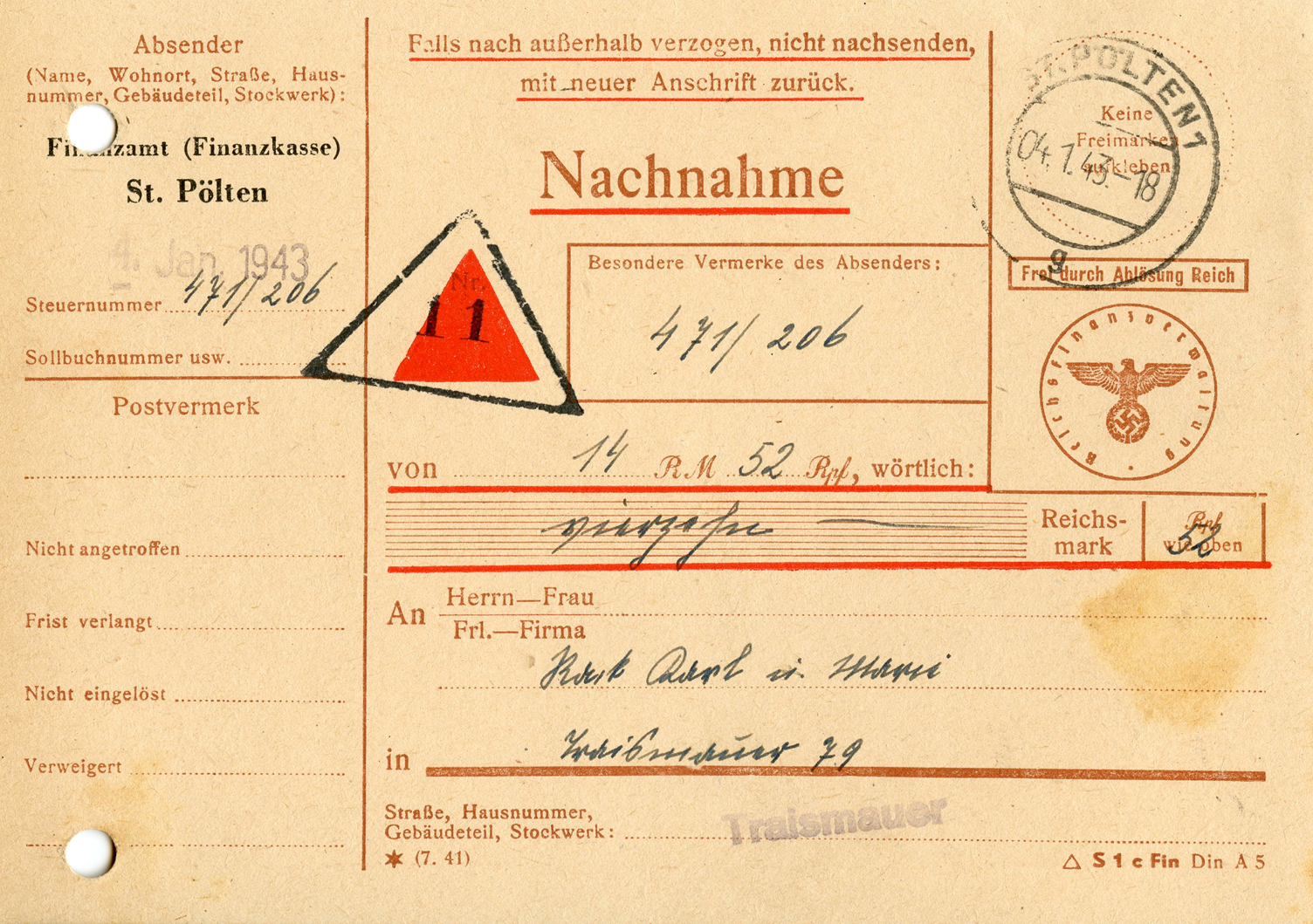 [Below: Here are a variety of postal forms and receipts. This first one is a 'cash on delivery (COD)' receipt from St. Pölten, January 4, 1943.]