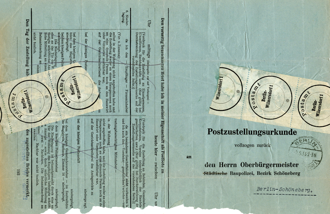[Below: This is a proof of delivery official letter from the Mayor of Schöneberg, with official tape that was used to officially seal the letter.]