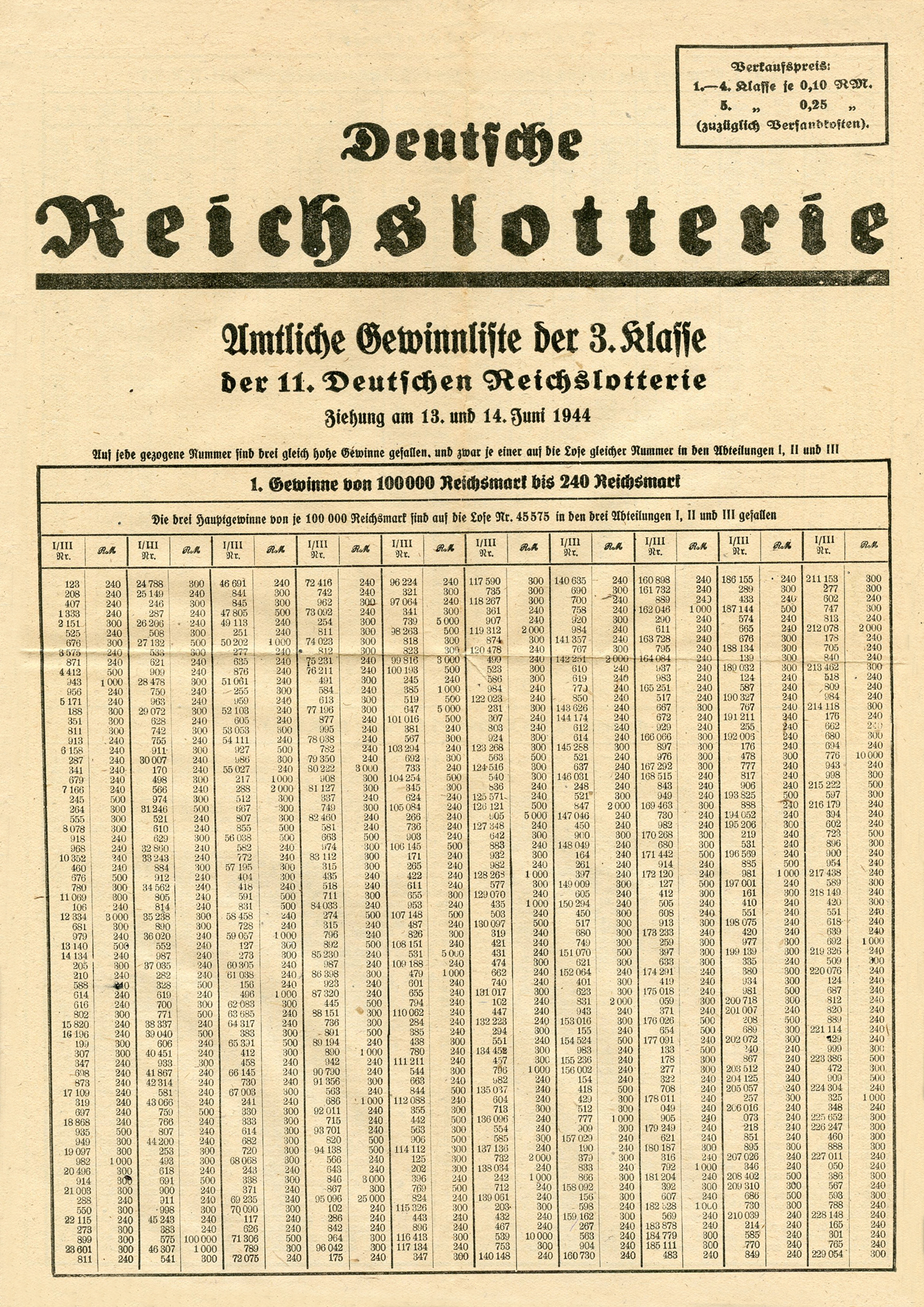 [Below: Lottery information sheet from June 13-14, 1944. Page one. Click to enlarge.]