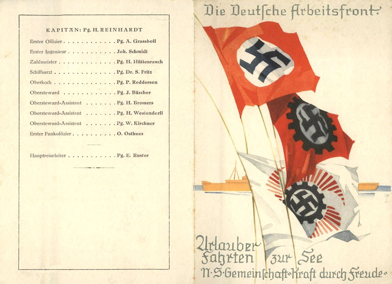 [Below: 'Kraft durch Freude' (KdF) menu. Strength Through Joy was a revolutionary social program that enabled every working person to have a vacation cruise. There were a ton of social improvements and downright revolutionary ideas. No interest loans were only a small part of the myriad of ideas that National Socialism and Adolf Hitler brought to life. Click to see many more Strength Through Joy items - menus, postcards, cancels, etc.]