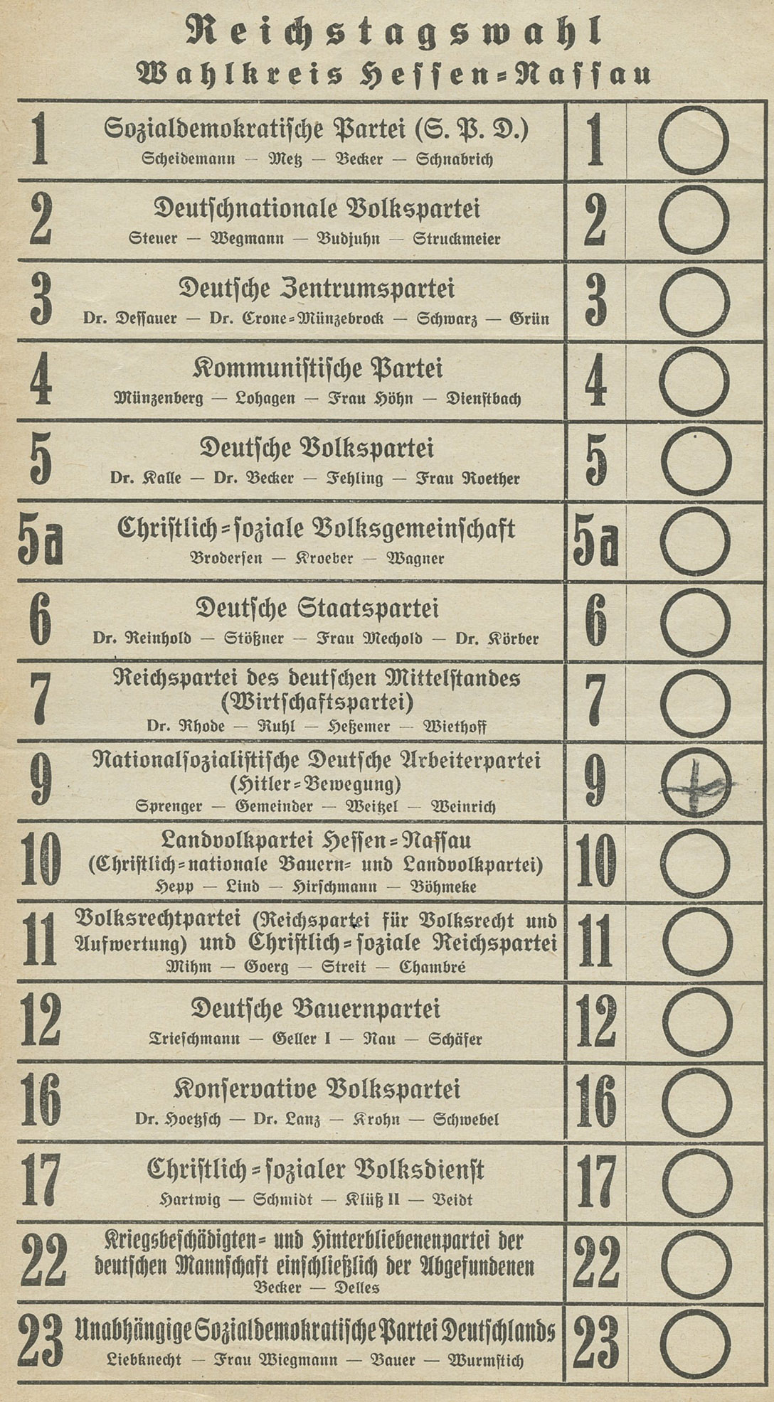 [Below: Here are voting ballots that show the madness of early German elections. Just look at all those political parties! But check out number nine and note this is the party checked by the voter. It says the 'Hitler-Bewegung', or Hitler Movement, this was the early popular name for the NSDAP. All of the ballots are made of extremely flimsy, thin paper.]