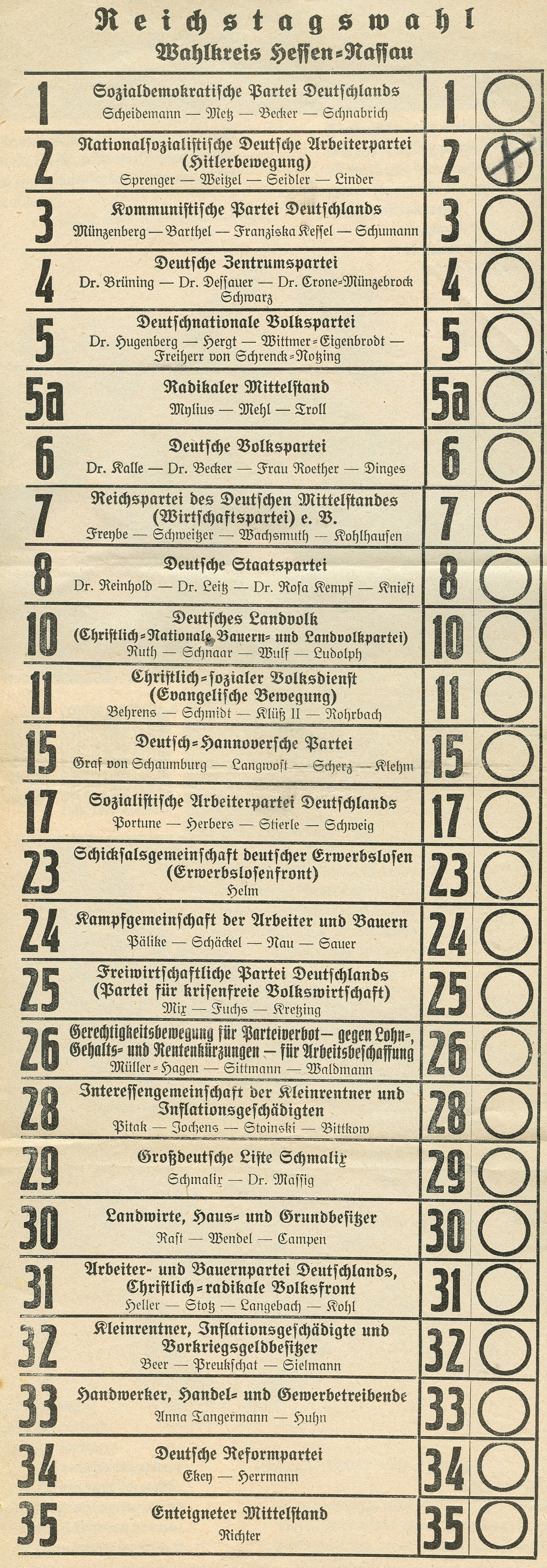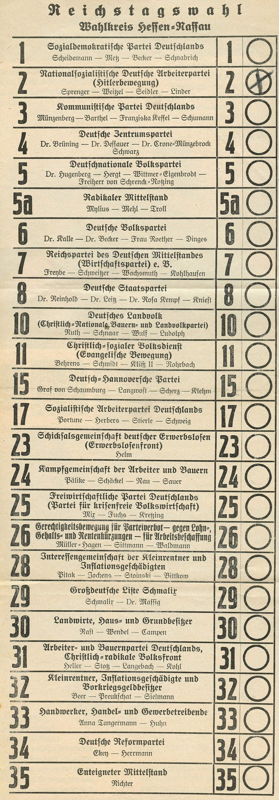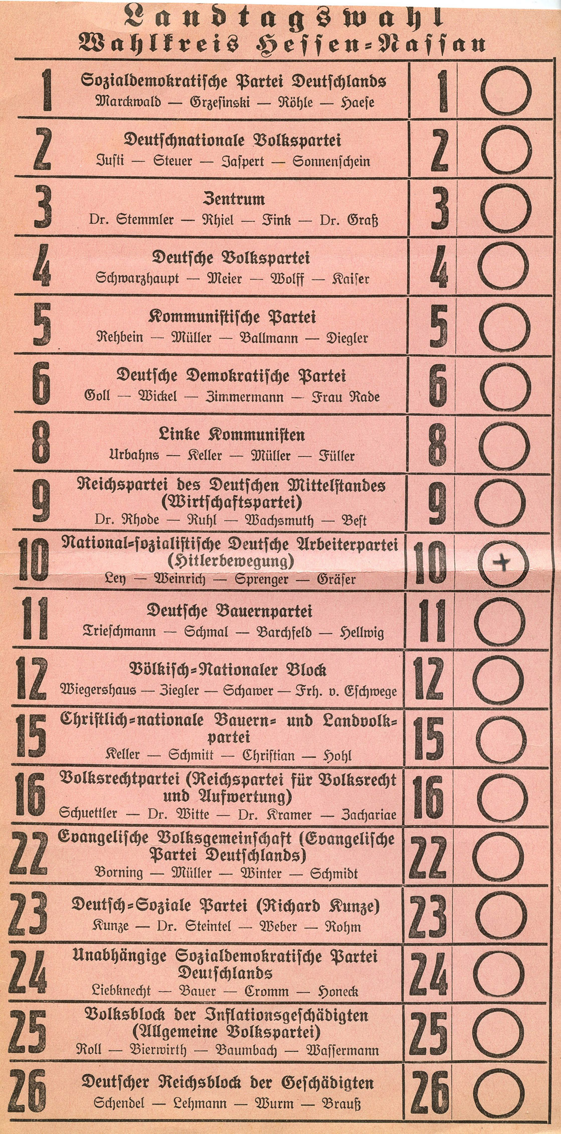 [Below: Even larger than the last one, this one has 26 candidates instead of the 23 above. This is also a very early ballot, with the NSDAP called 'Hitler-Bewegung', or Hitler Movement (#10 on the ballot). Click to enlarge.]