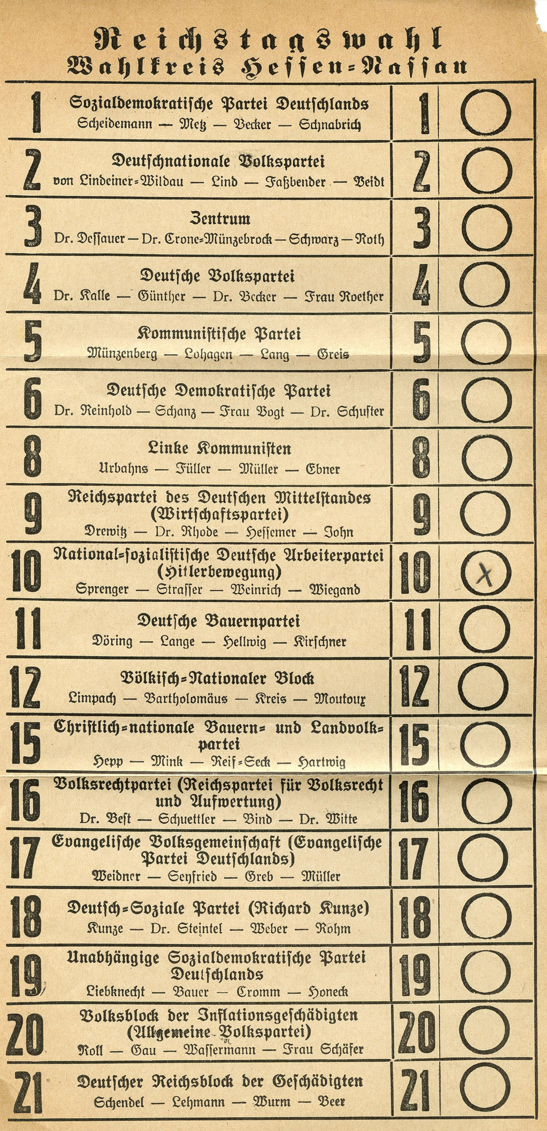 [Below: Smaller than the last one, this one has only 21 candidates. This is also a very early ballot, with the NSDAP called 'Hitler-Bewegung', or Hitler Movement (#10 on the ballot). Of historical significance 'Strasser' is listed on the ballot with the NSDAP. The Strasser brothers were early members who betrayed the party early on. Click to enlarge.]