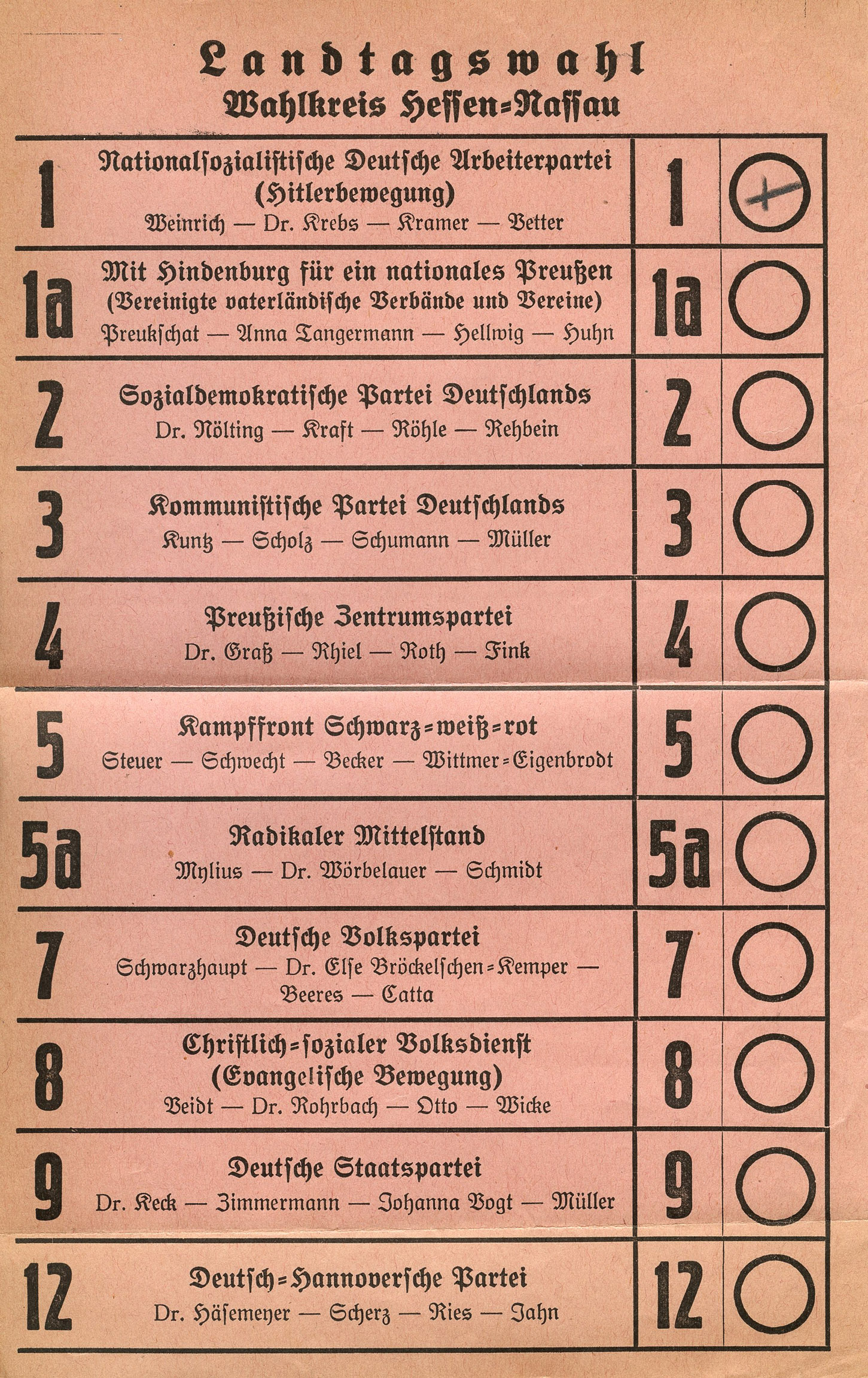 [Below: A much smaller ballot, but this time the NSDAP is choice #1. This is also a very early ballot, with the NSDAP called 'Hitler-Bewegung', or Hitler Movement. Click to enlarge.]