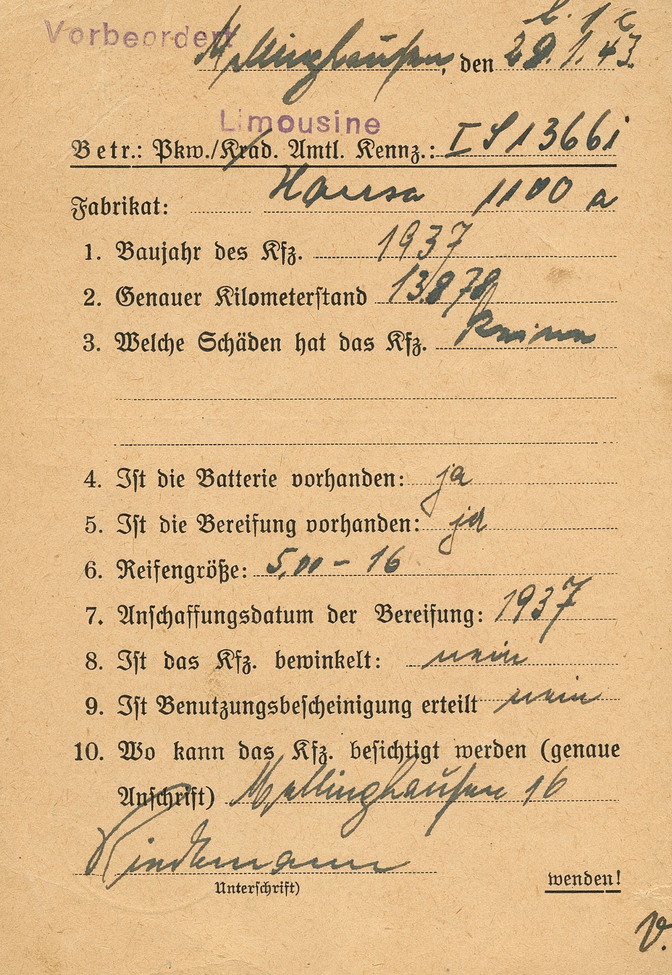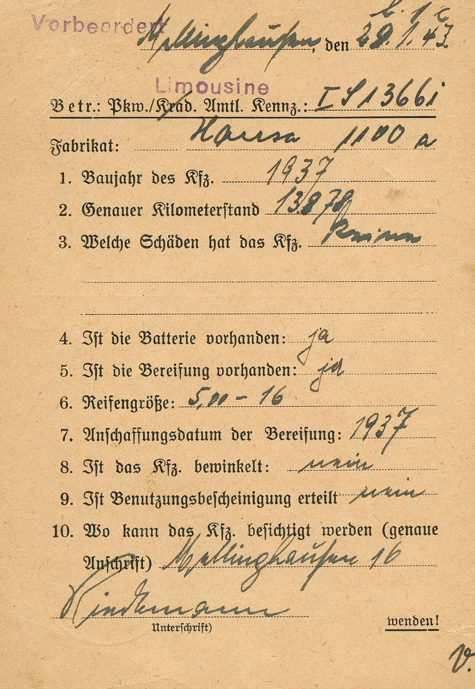 [Below: This is so cool. This is a certificate for a personal car to be used as a taxi (limousine - sedans are called this in German). It has a very rare stamp and its usage on a document makes it even rarer. So this is basically 'Nazi' Uber! Haha... Click to see more.]