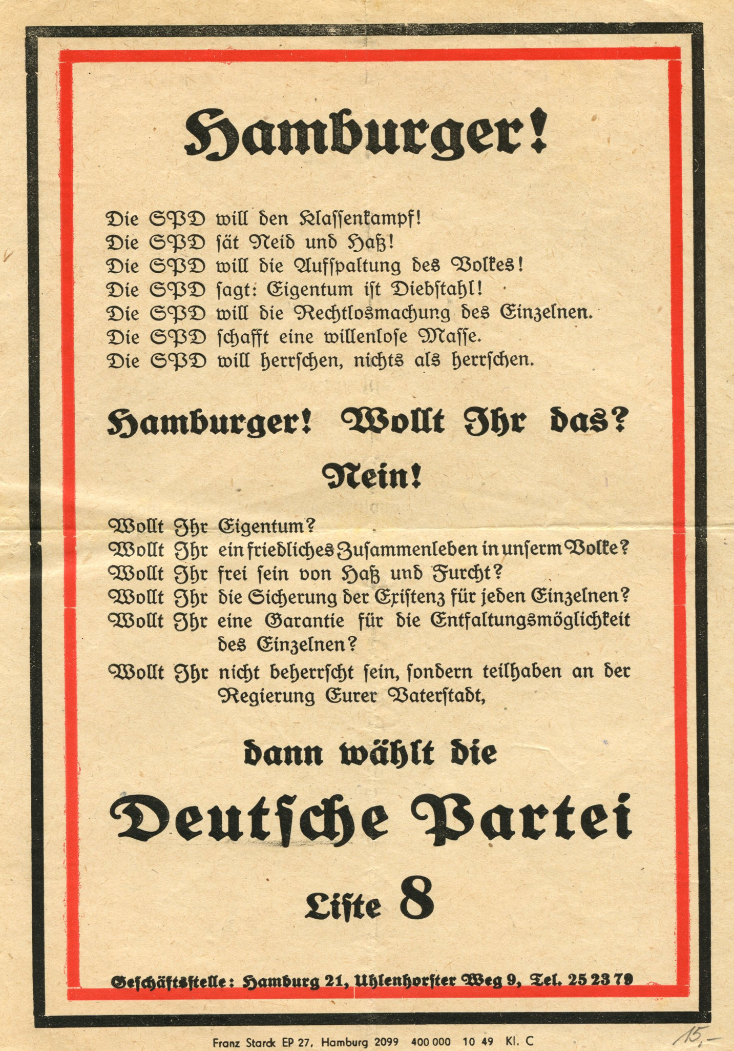 [Below: This is a leaflet for the Deutsche Partei. The SPD they mention is the Social Democratic Party of Germany, which were the leading party in Germany. I'm unsure who this Hamburg German Party were. It says: