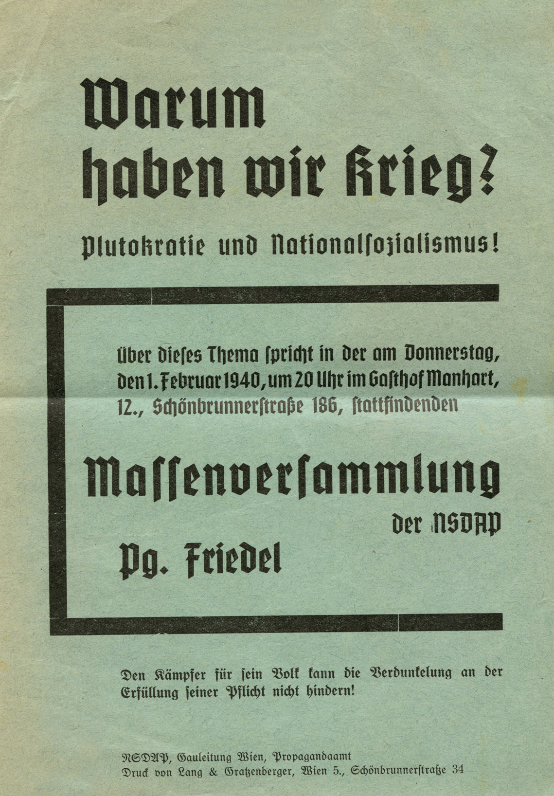 den 1.Februar 1940, um 20 Uhr im Gasthof Manhart,