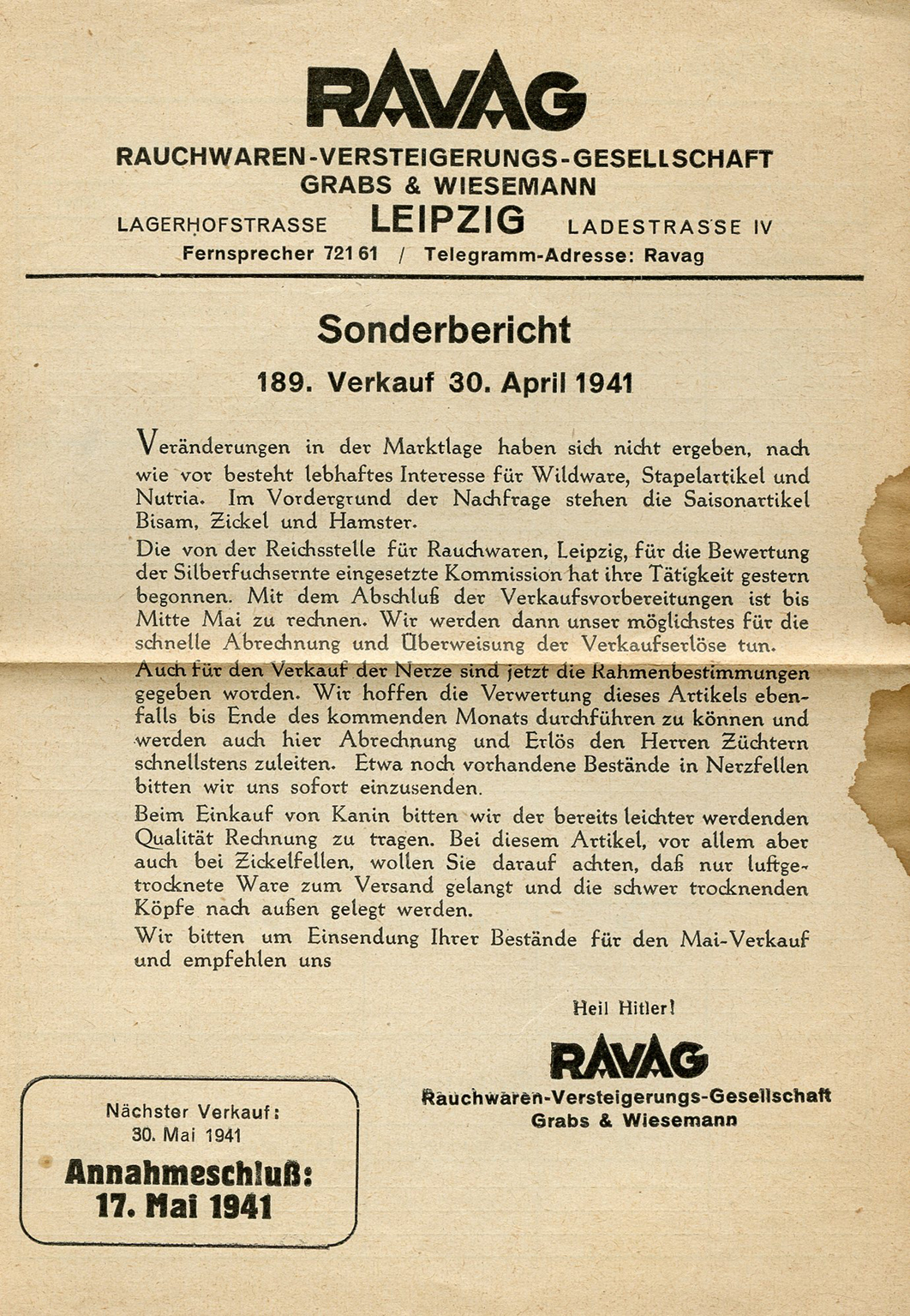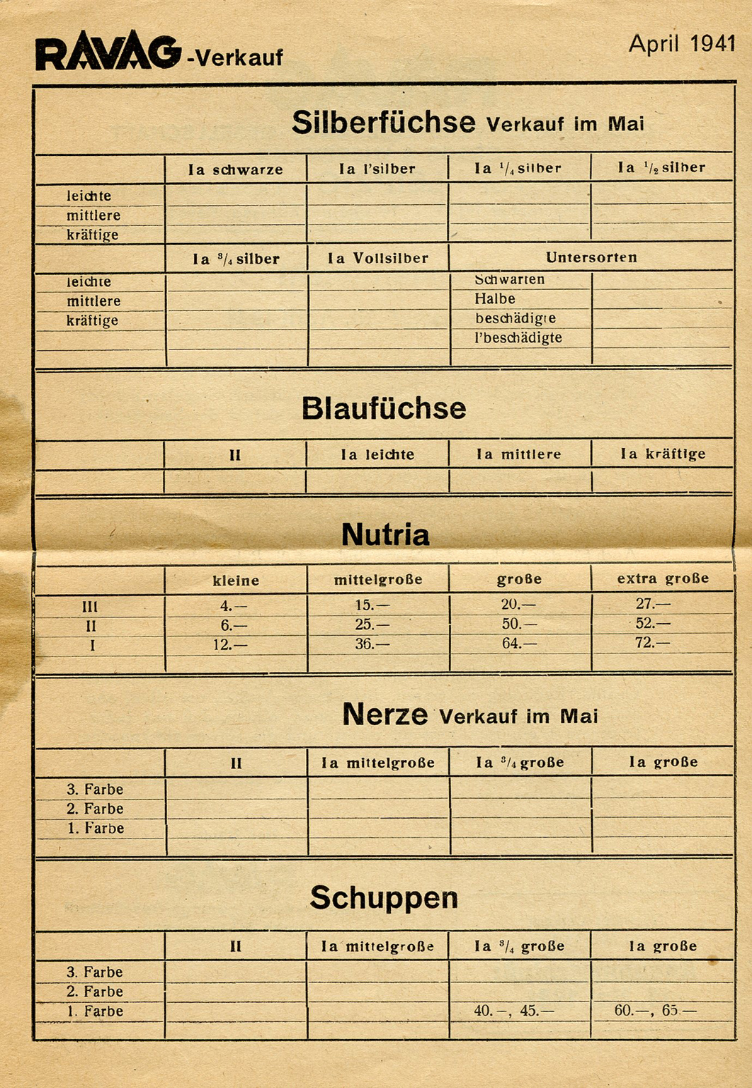 There have been no changes in the market situation, although there is still lively interest in wild goods, staple items and nutria. The main demand is for the seasonal items muskat, goats and hamster.)