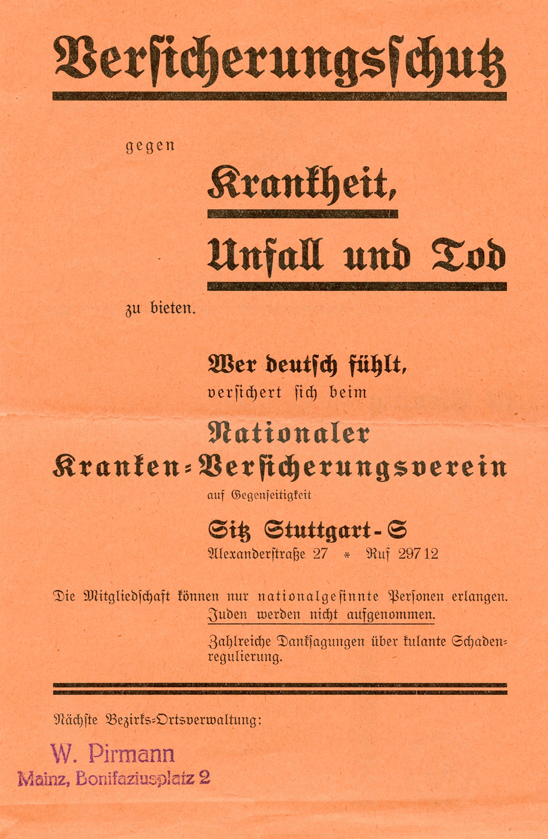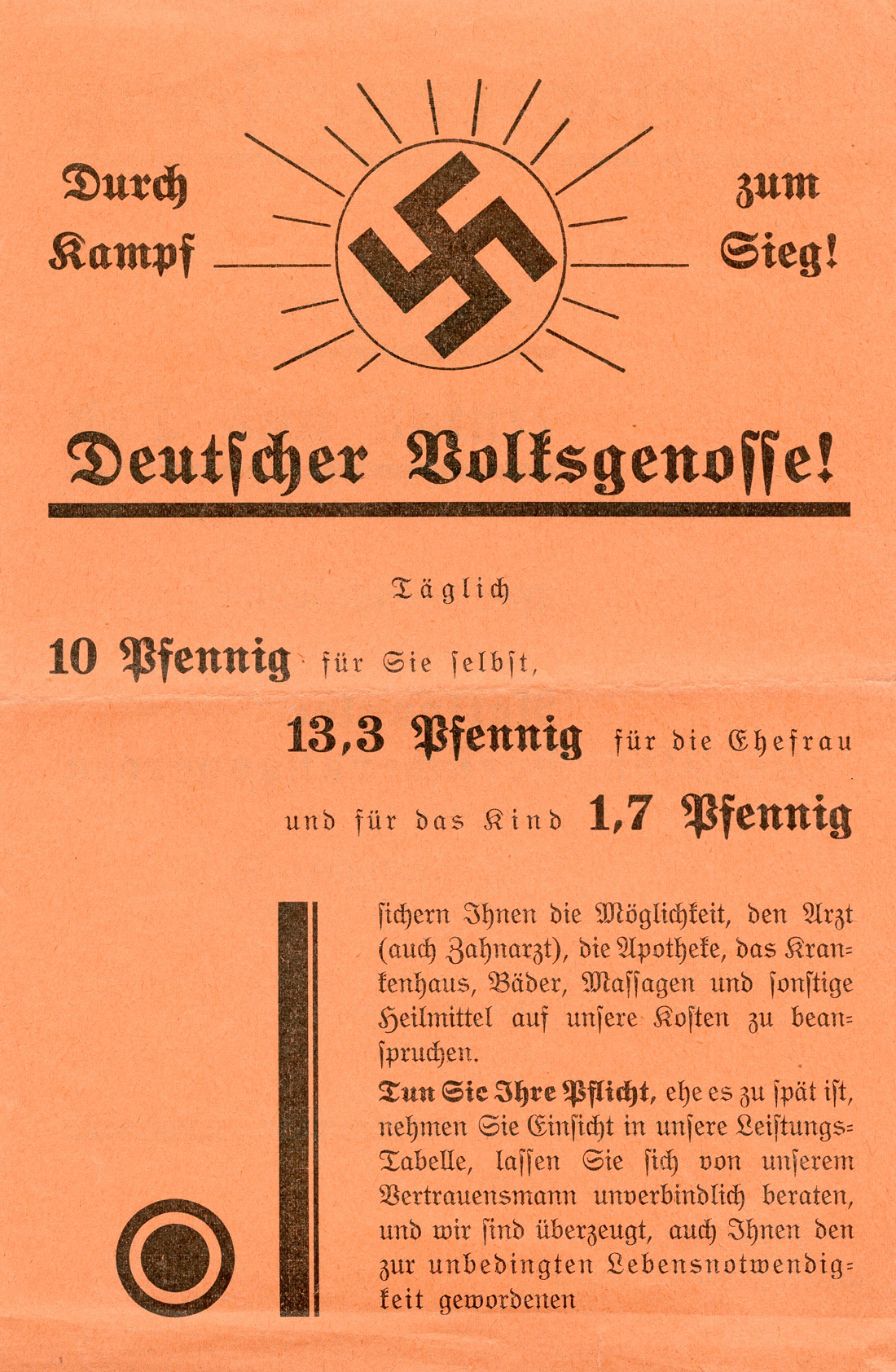 Tun Sie Ihre Pflicht, ehe es zu spät ist, nehmen Sie Einsicht in unsere Leistungs=Tabelle, lassen Sie sich von beraten, und wir sind überzeugt, auch Ihnen den zur unbedingten Lebensnotwendig=keit gewordenen'