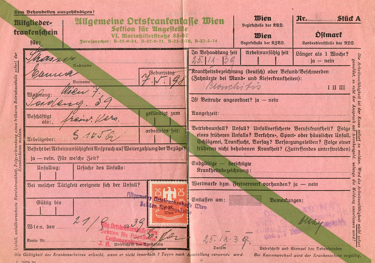 [Below: This is a medical document from 1939 in Vienna. The patient has bronchitis. The medical revenue stamp here is rare and many times rarer on the actual document. Click to see more.]