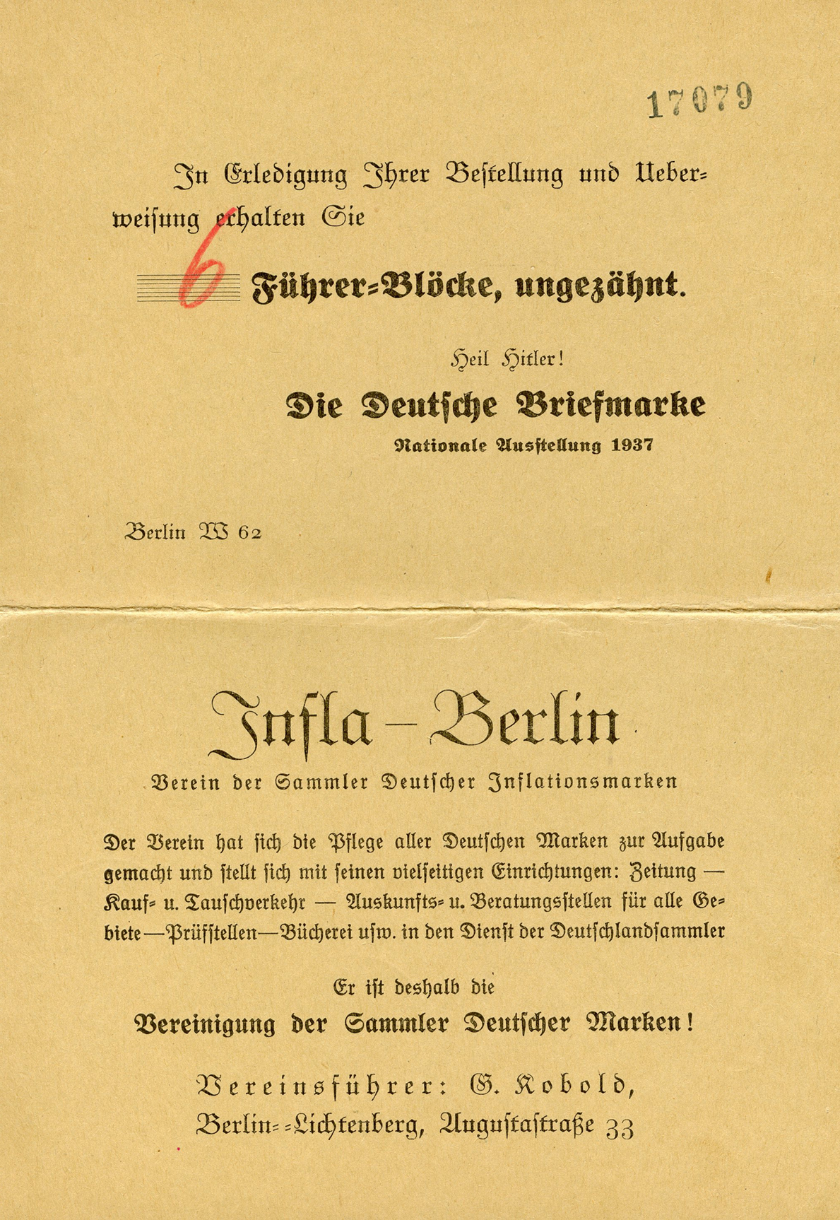 'Upon completion of your order and payment, you will receive 6 Führer blockts, imperforate. - Heil Hitler! - The German Postage Stamp National Exhibition 1937.']
