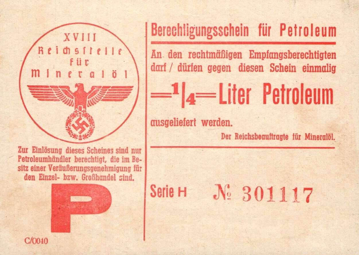 [Below: A petroleum ration coupon for 1/4 Liter. On the left it says: