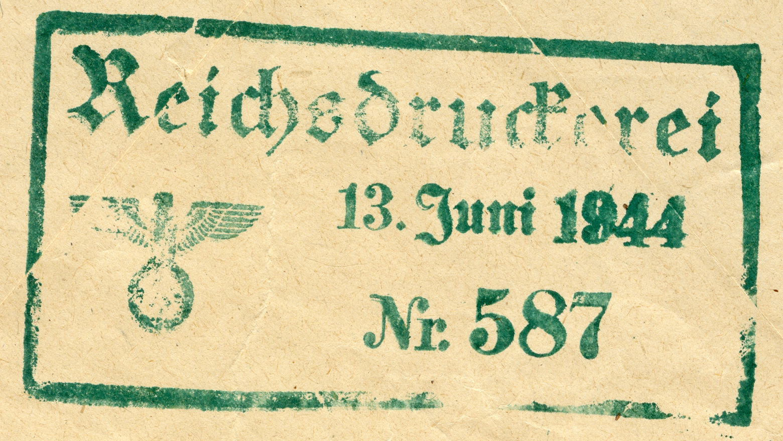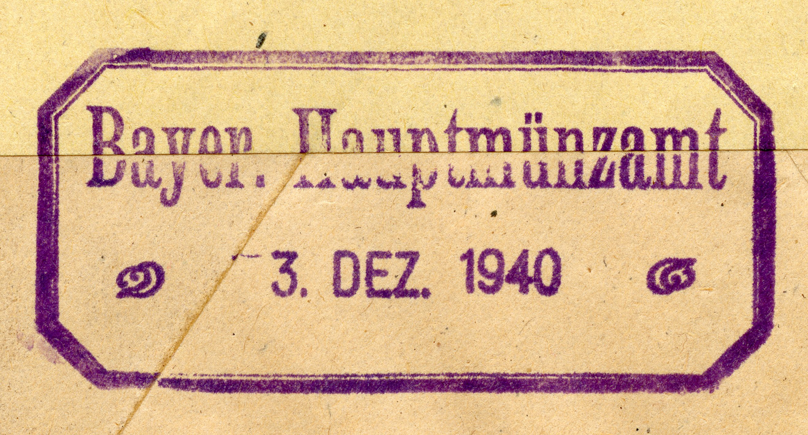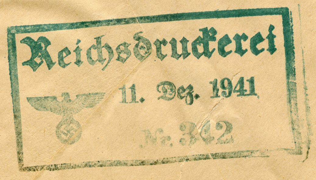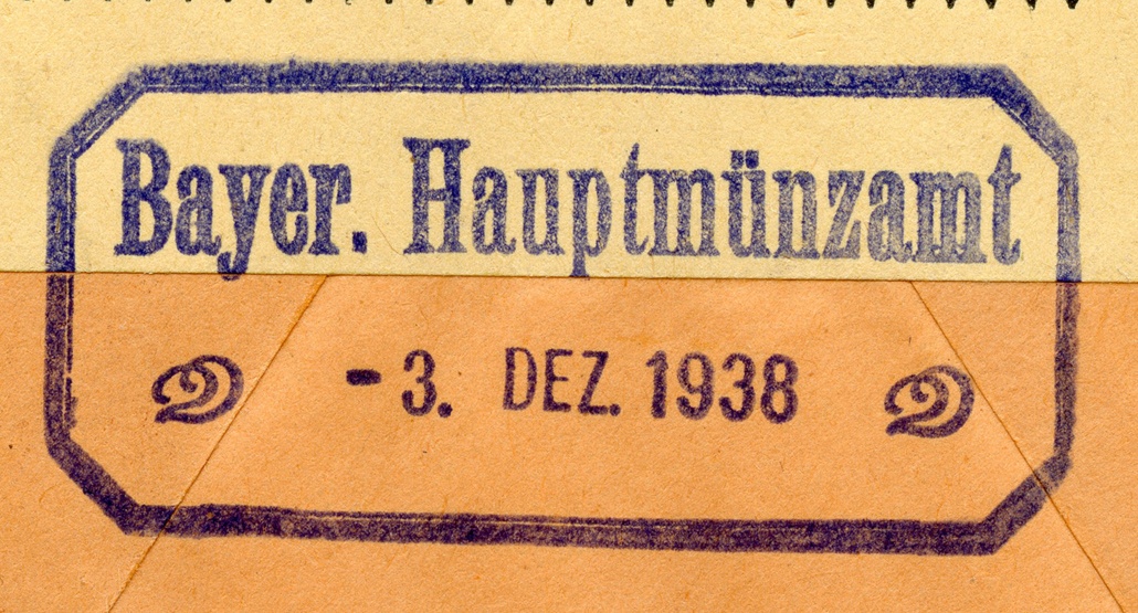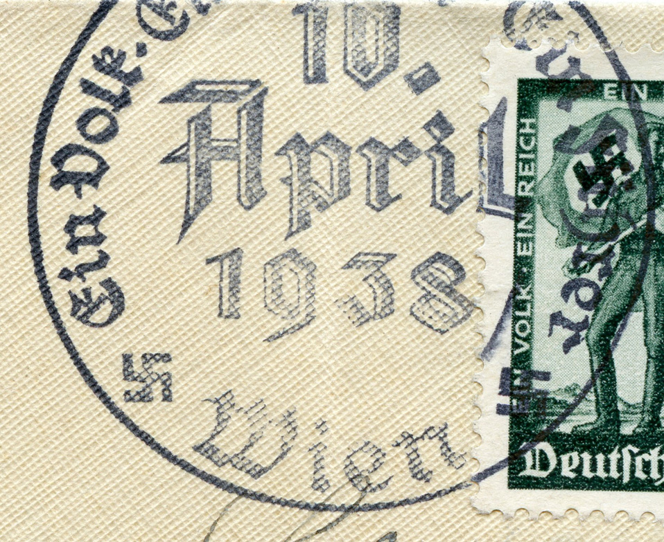 [Below: Postmark close-up. The cursive words are called 'Sütterlin' script and can be very difficult to read. Oddly, there were even typewriters whose keys typed in the Sütterlin script.]