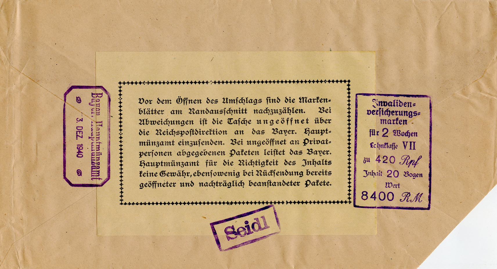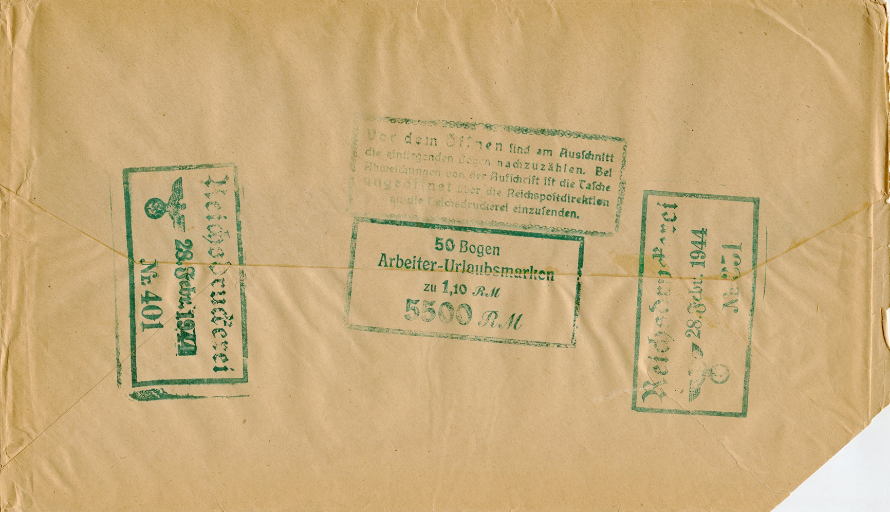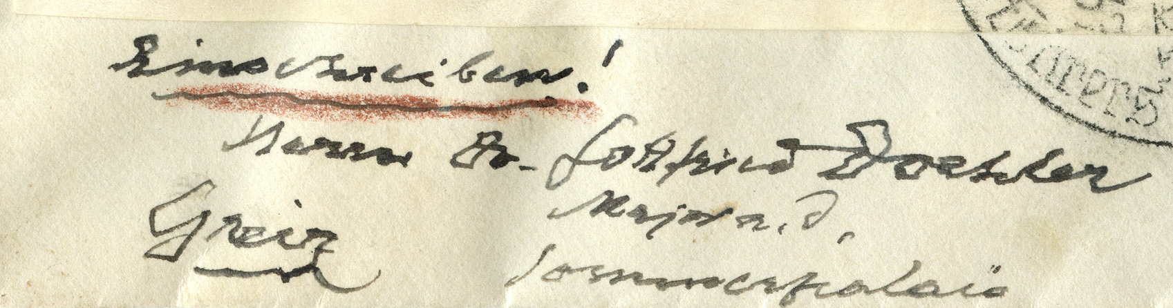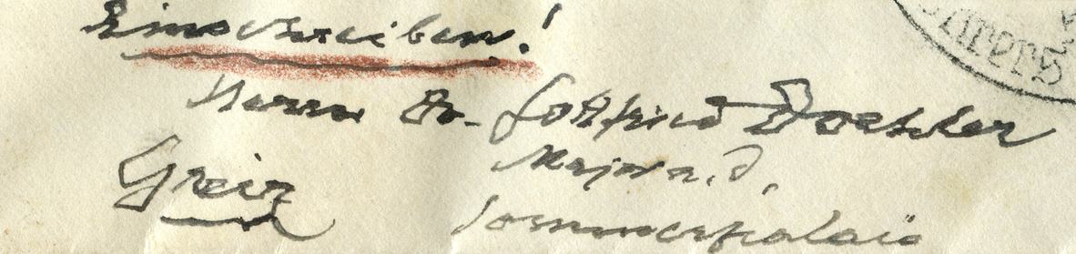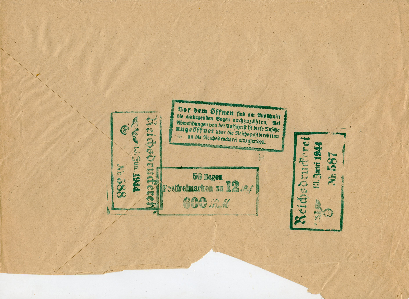 [Below: Postmark close-up. The cursive words are called 'Sütterlin' script and can be very difficult to read. Oddly, there were even typewriters whose keys typed in the Sütterlin script.]