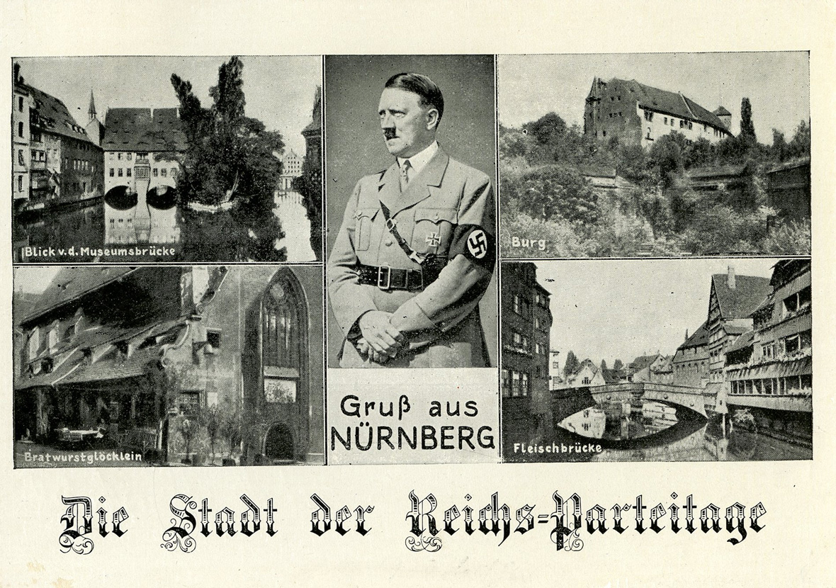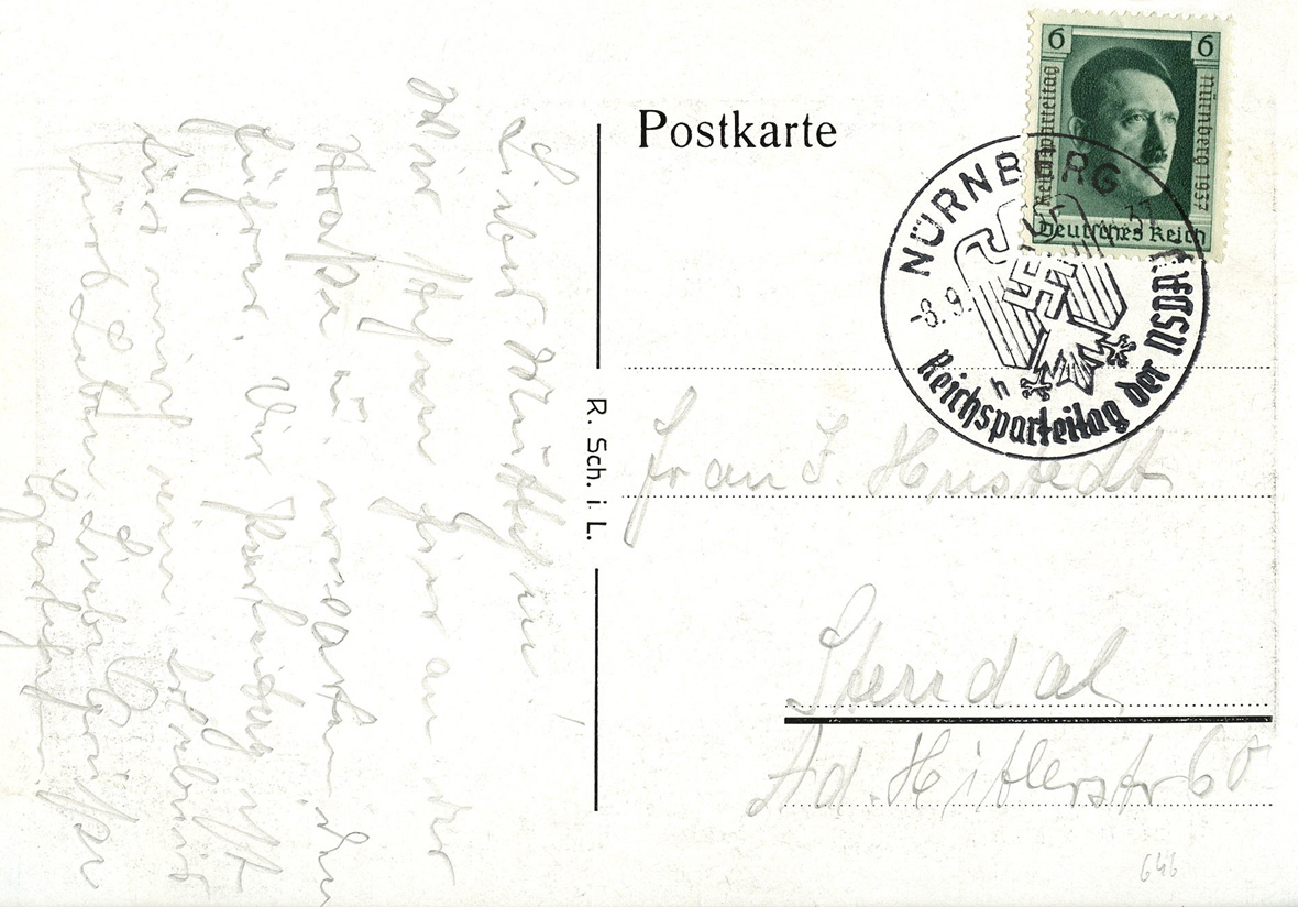 [Below: Postcard using overprinted stamps from the souvenir sheet above and postmarked with a special Reich Party Day cancel on September 3, 1937.]
