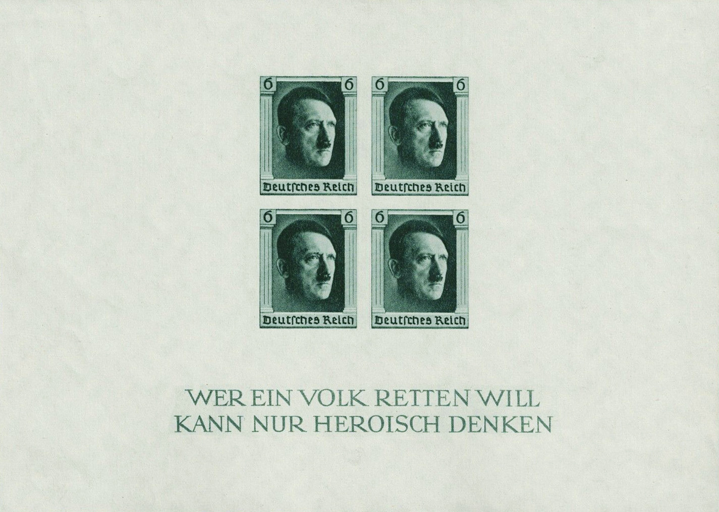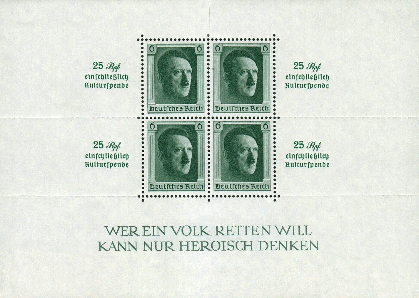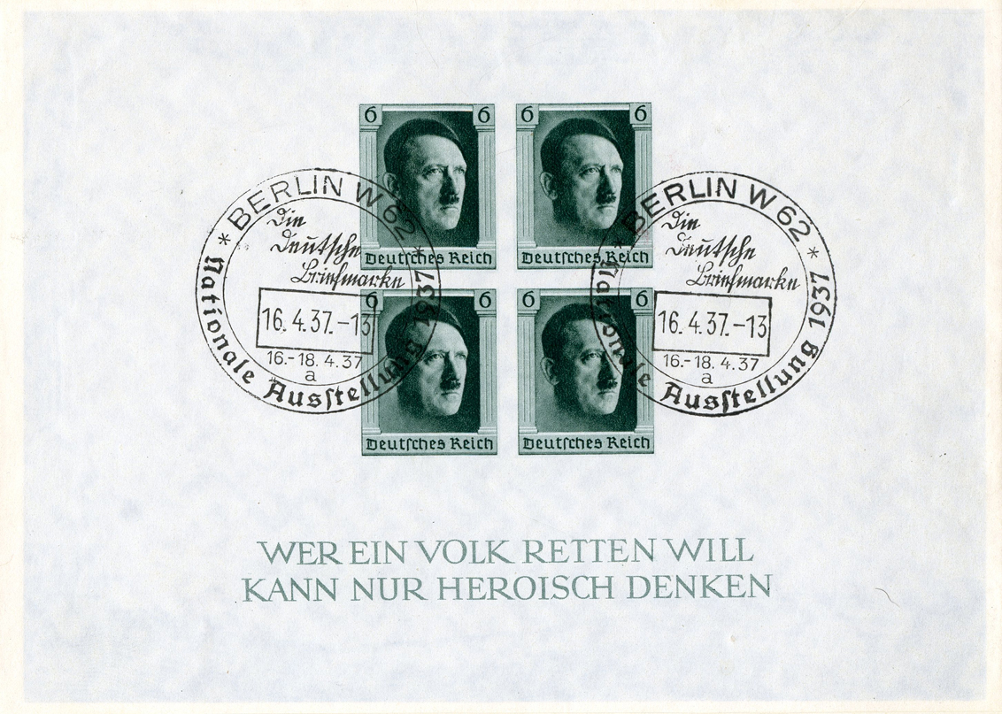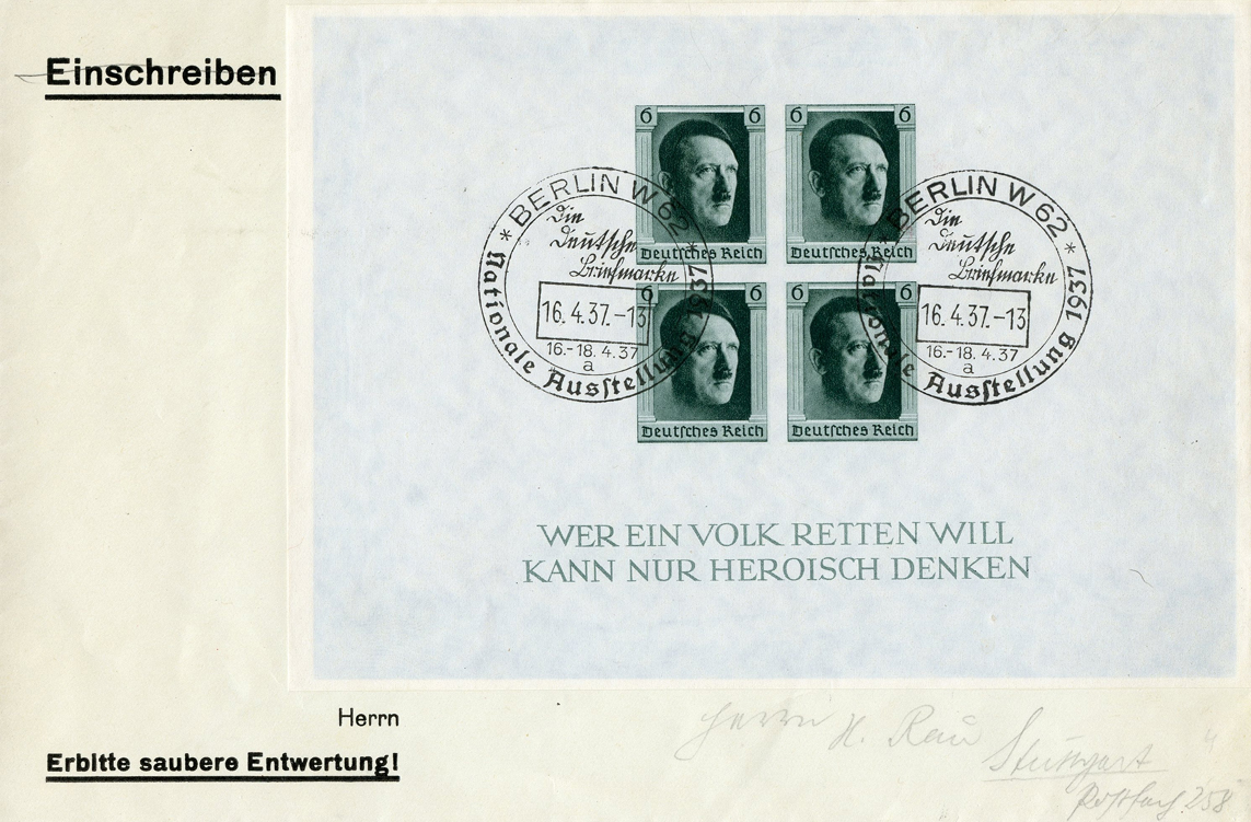 [Below: Souvenir sheet of the type inside the top wrapper above. This was released on April 5, 1937 and was done by the artist Prof. R. Klein. This issue celebrated the 48th birthday of Adolf Hitler.