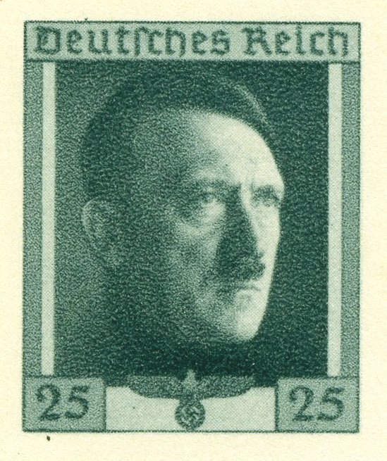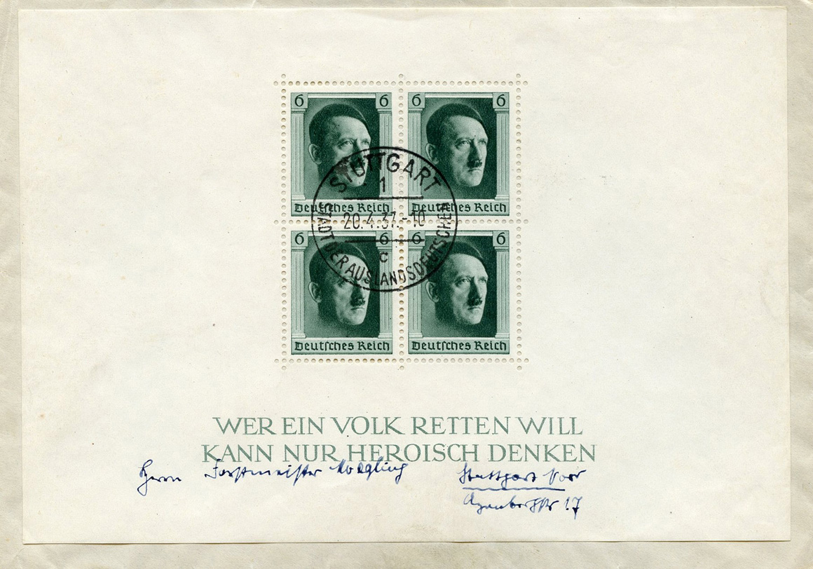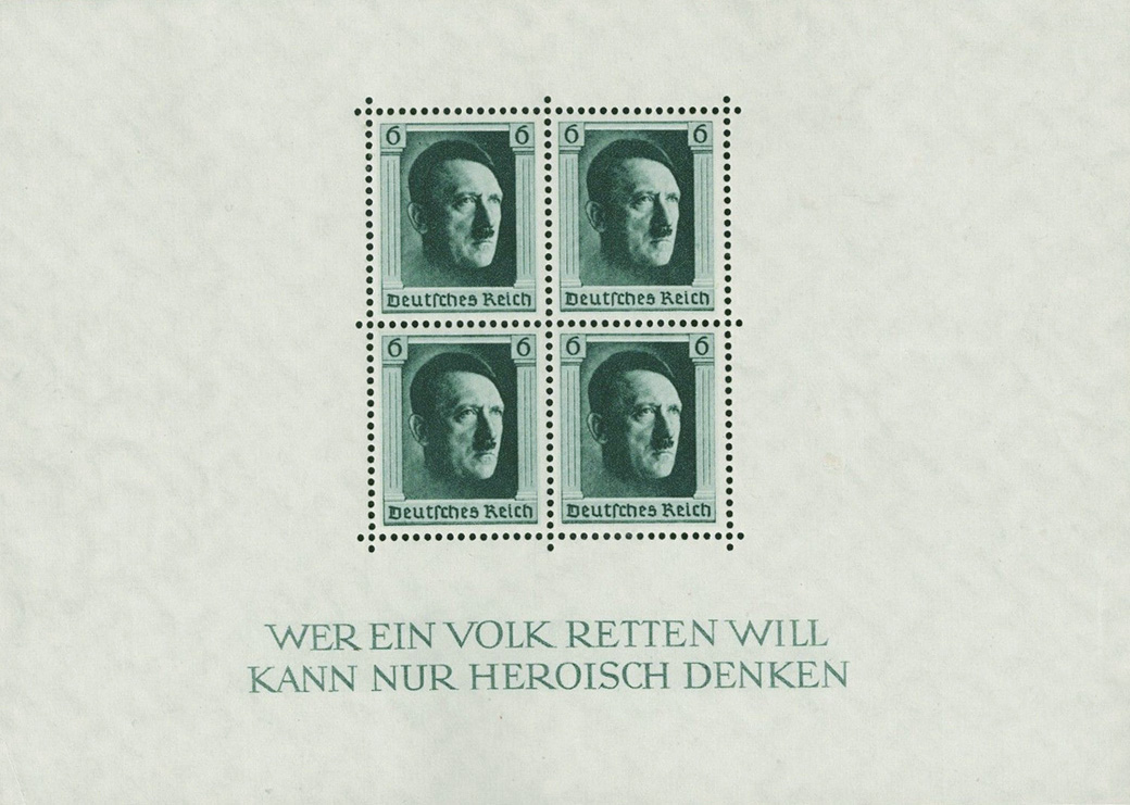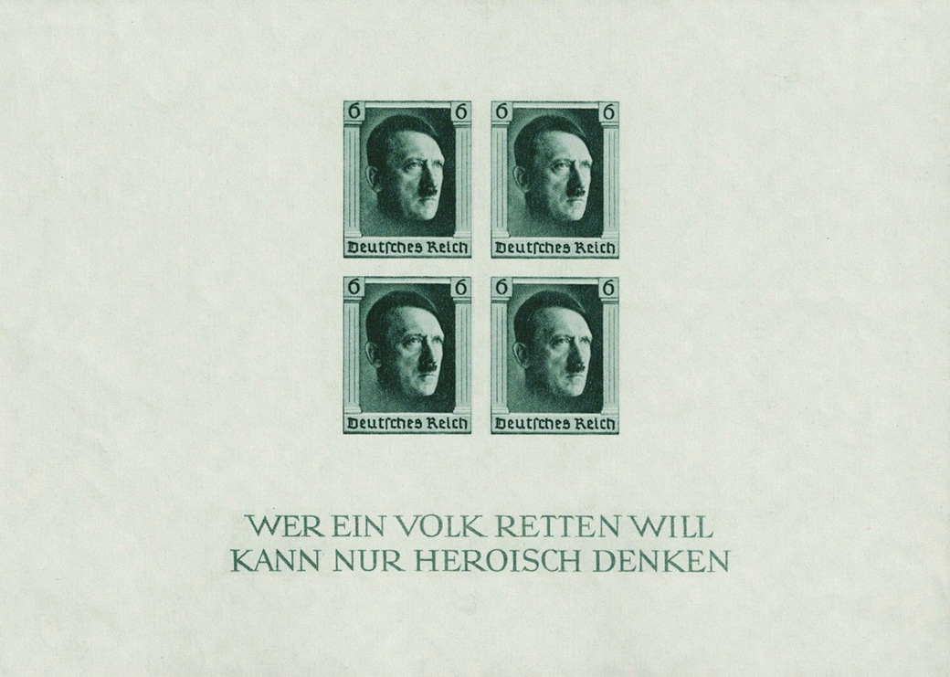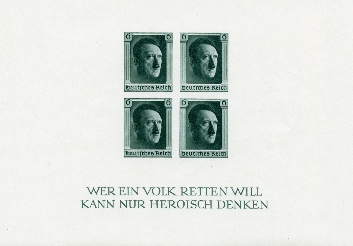 [Below: Souvenir sheet of the type inside the top wrapper above. This was released on April 5, 1937 and was done by the artist Prof. R. Klein. This issue celebrated the 48th birthday of Adolf Hitler.