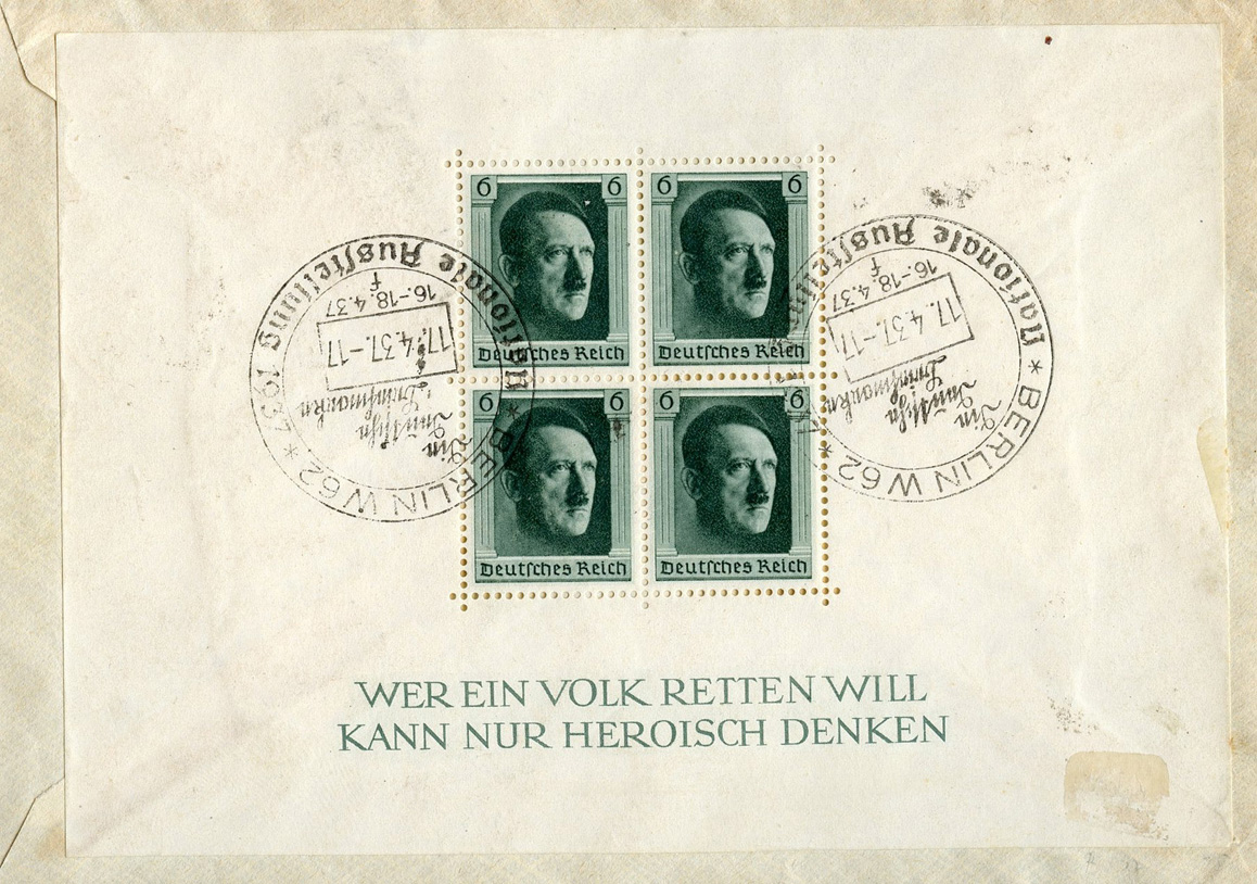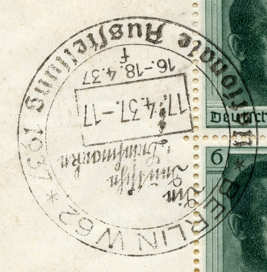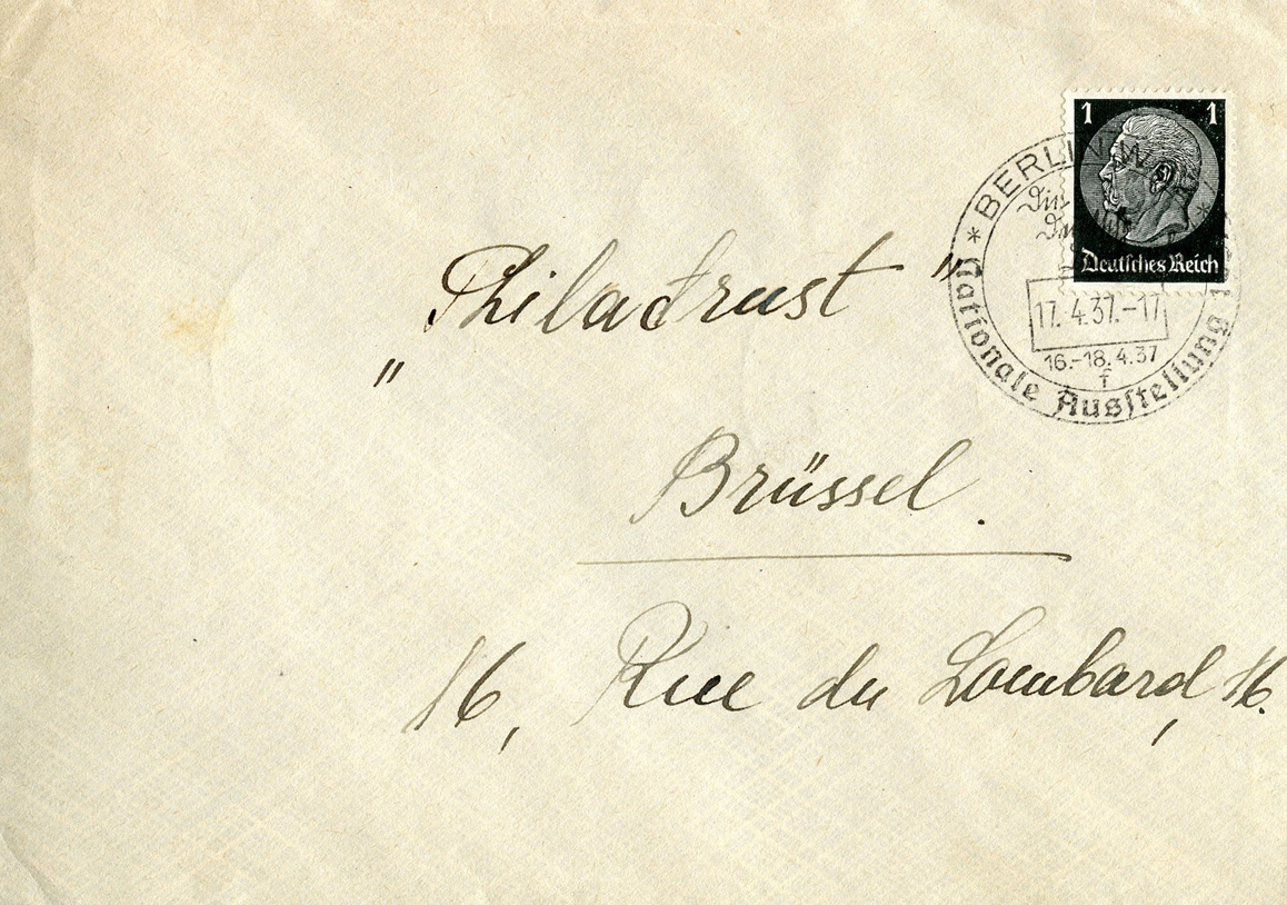 [Below: This envelope was postmarked in Berlin on April 17, 1937 and sent to Brussels, Belgium. Nationale Ausstellung means 'National exhibition' stamp show.]