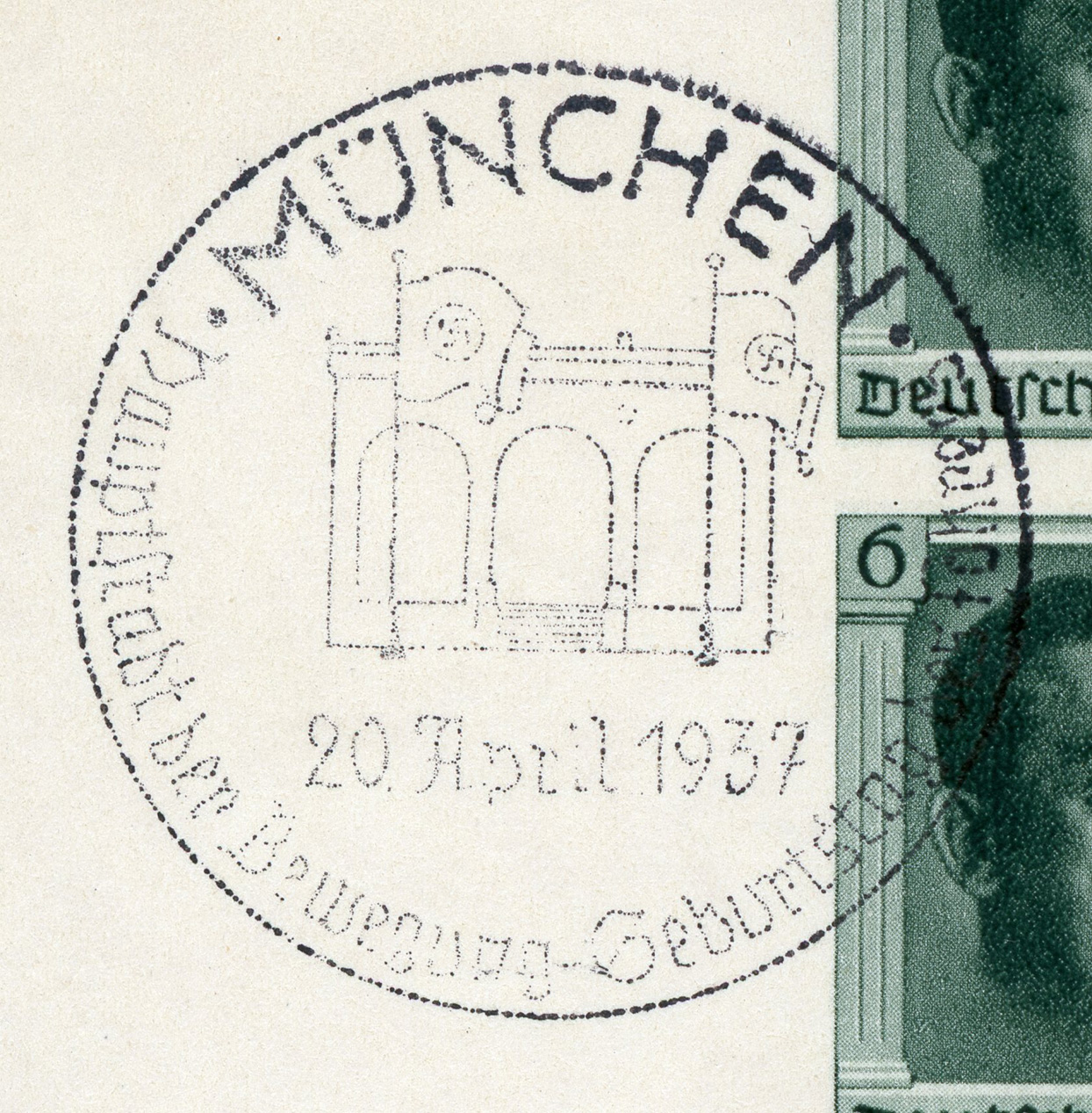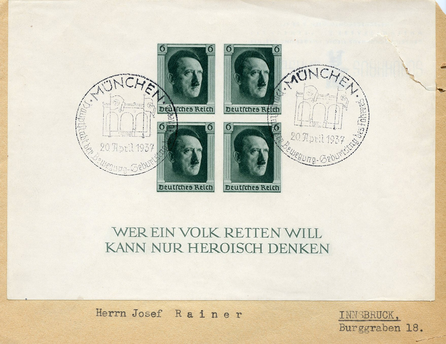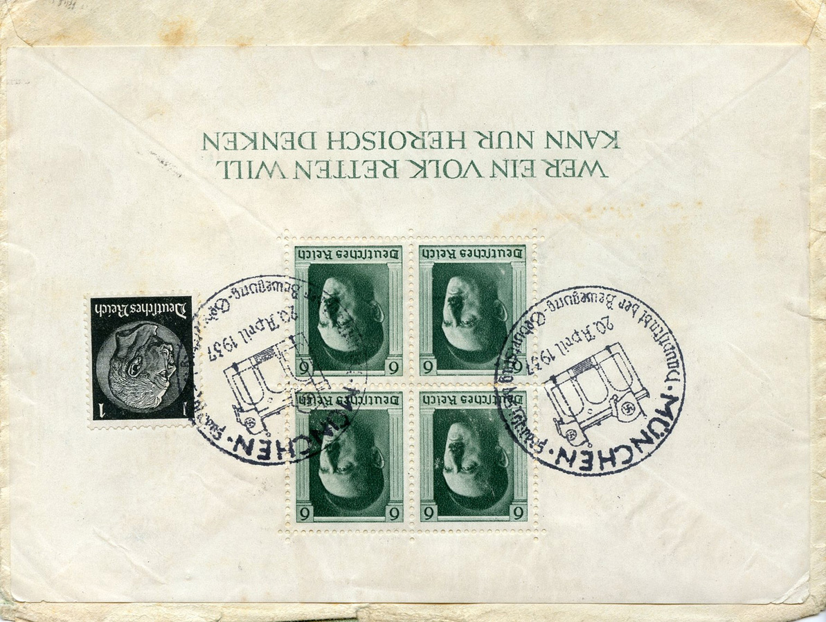 [Below: This envelope, using the imperforate version of the sourvenir sheet, was postmarked in Munich on April 20, 1937 and sent to Innsbruck. The words 'Hauptstadt der Bewegung-Geburtstag des Führers' mean 'Capital of the Movement-The Führers' Birthday'.]