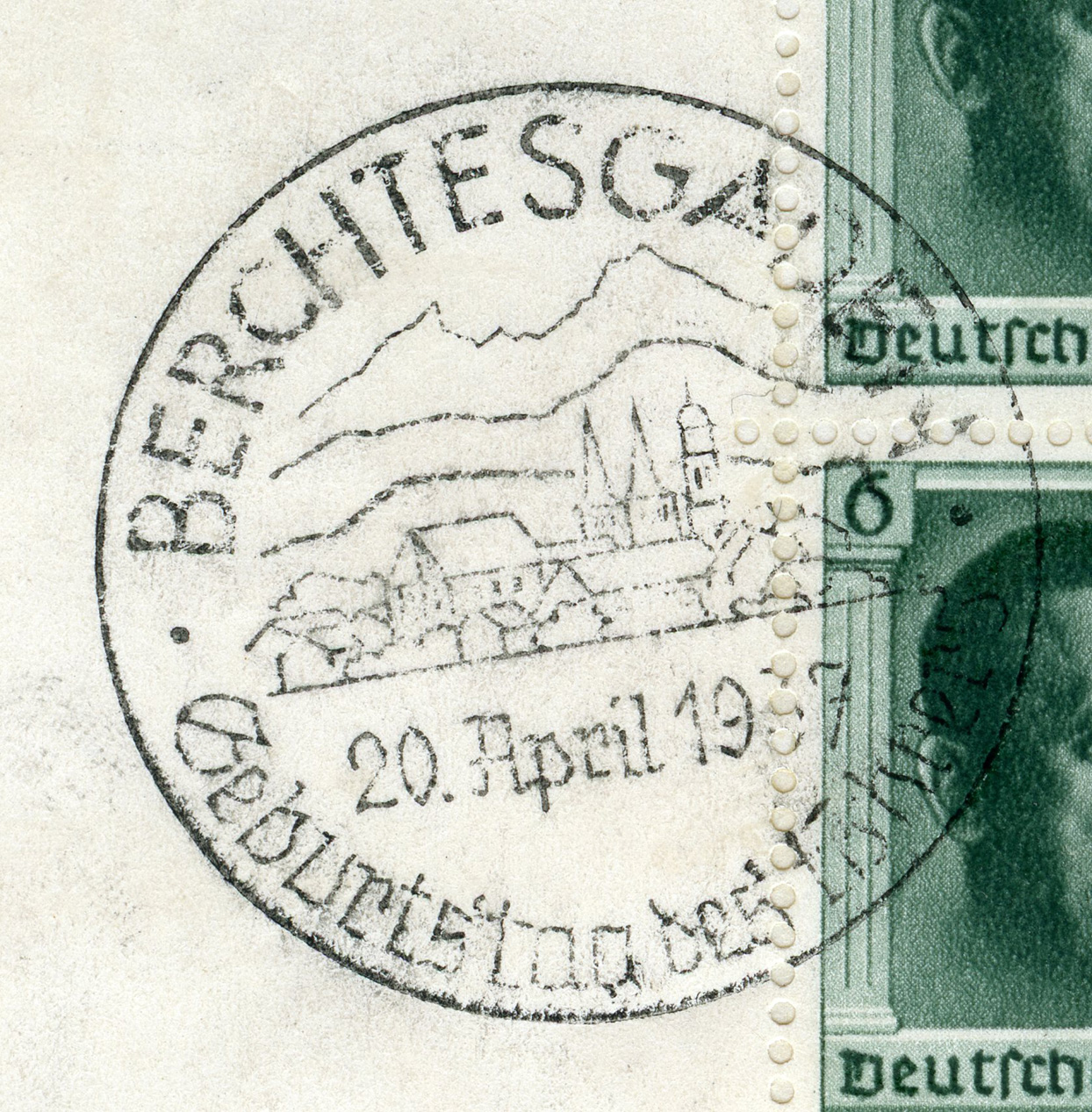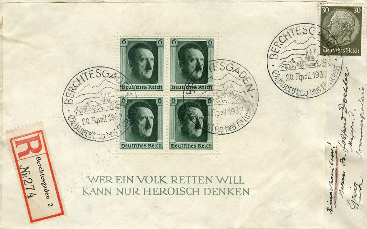 [Below: Individual stamps and the souvenir sheets themselves were used as postage. Below are examples with different cancels. The envelope below was sent on April 20, 1937 to Greiz, Germany. It was sent registered mail from Berchtesgaden and arrived on the same day -- now that's service!]