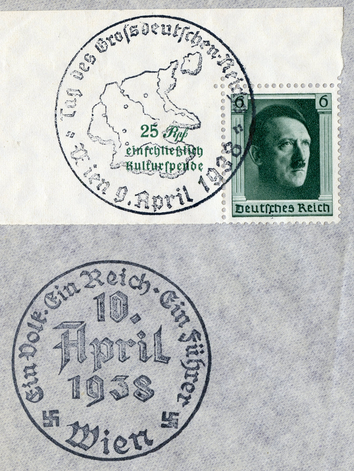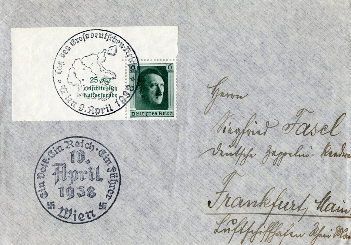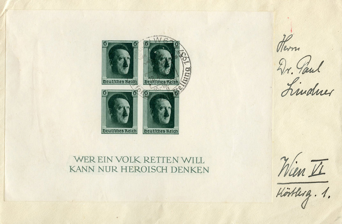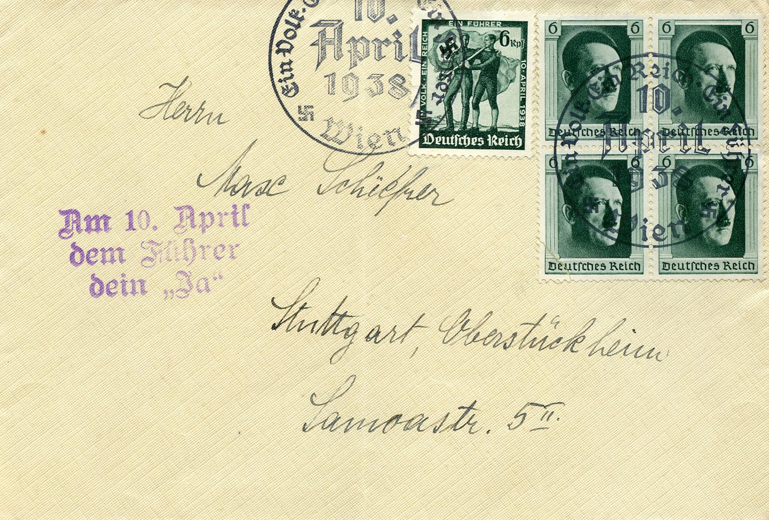 [Below: This envelope was postmarked with the special cancel from the April 10, 1938 Austrian Anschluss (vote to rejoin Germany). It uses a perforate block of four from the sourvenir sheet and was sent to Stuttgart.]